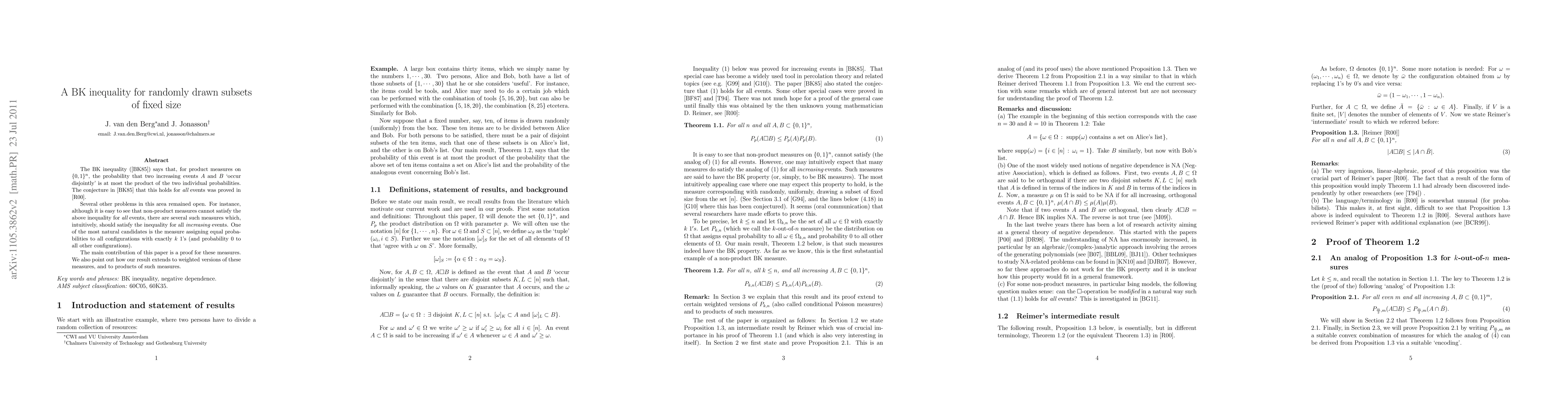 The BK inequality (\cite{BK85}) says that,for product measures on $\{0,1\}^n$, the probability that two increasing events $A$ and $B$ `occur disjointly' is at most the product of the two individual probabilities. The conjecture in \cite{BK85} that this holds for {\em all} events was proved by Reimer (cite{R00}). Several other problems in this area remained open. For instance, although it is easy to see that non-product measures cannot satisfy the above inequality for {\em all} events,there are several such measures which, intuitively, should satisfy the inequality for all{\em increasing} events. One of the most natural candidates is the measure assigning equal probabilities to all configurations with exactly $k$ 1's (and probability 0 to all other configurations). The main contribution of this paper is a proof for these measures. We also point out how our result extends to weighted versions of these measures, and to products of such measures.