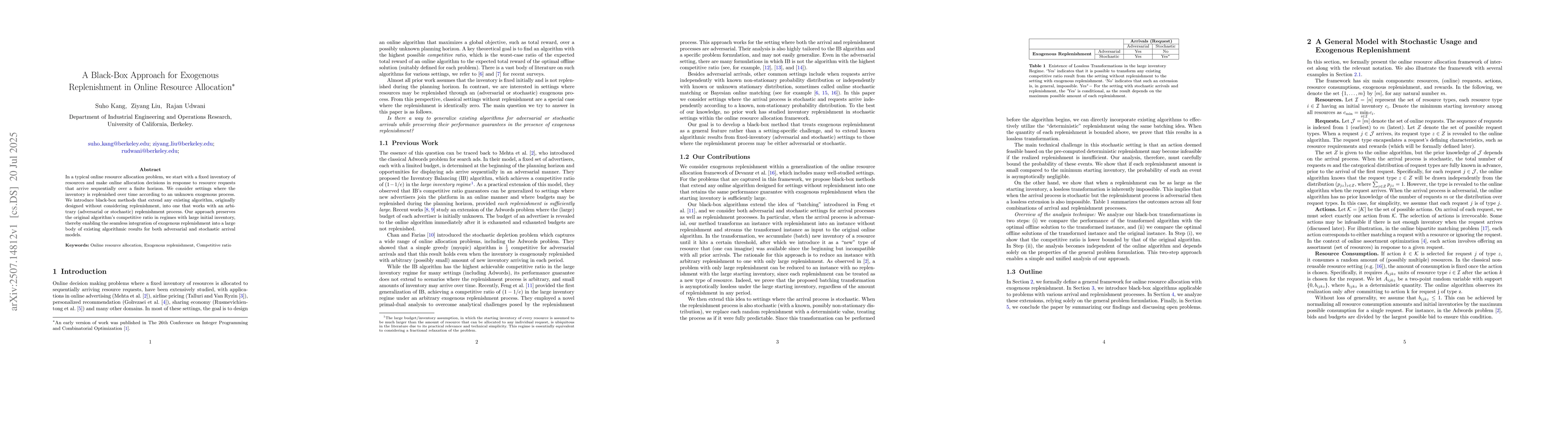 In a typical online resource allocation problem, we start with a fixed inventory of resources and make online allocation decisions in response to resource requests that arrive sequentially over a finite horizon. We consider settings where the inventory is replenished over time according to an unknown exogenous process. We introduce black-box methods that extend any existing algorithm, originally designed without considering replenishment, into one that works with an arbitrary (adversarial or stochastic) replenishment process. Our approach preserves the original algorithm's competitive ratio in regimes with large initial inventory, thereby enabling the seamless integration of exogenous replenishment into a large body of existing algorithmic results for both adversarial and stochastic arrival models.