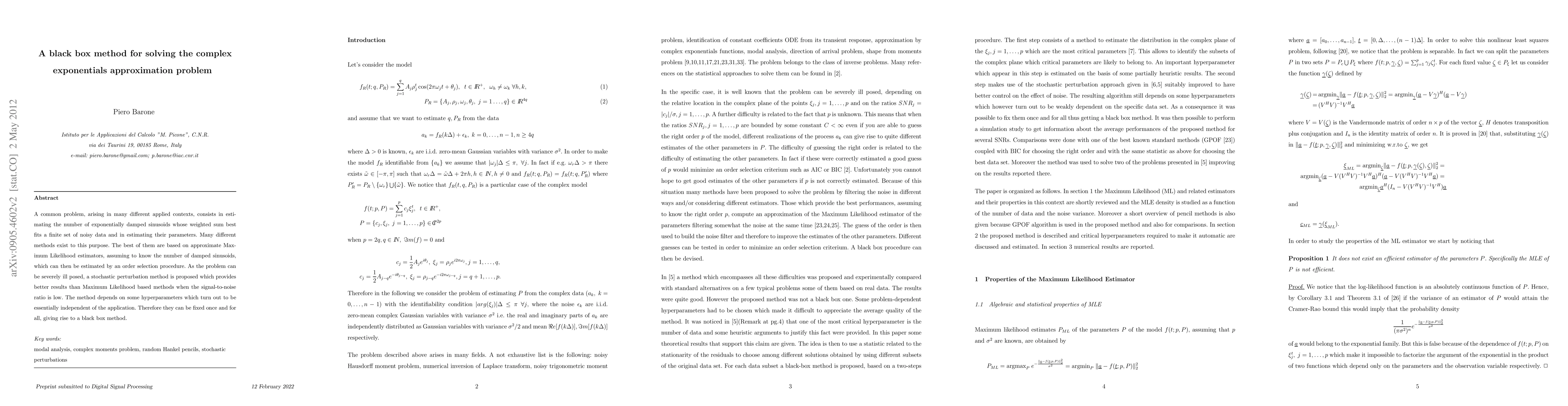 This paper proposes a black box method for solving the complex exponentials approximation problem, which estimates the number and parameters of exponentially damped sinusoids in noisy data. The method uses a stochastic perturbation technique to outperform traditional Maximum Likelihood estimators, especially in low signal-to-noise ratio scenarios.