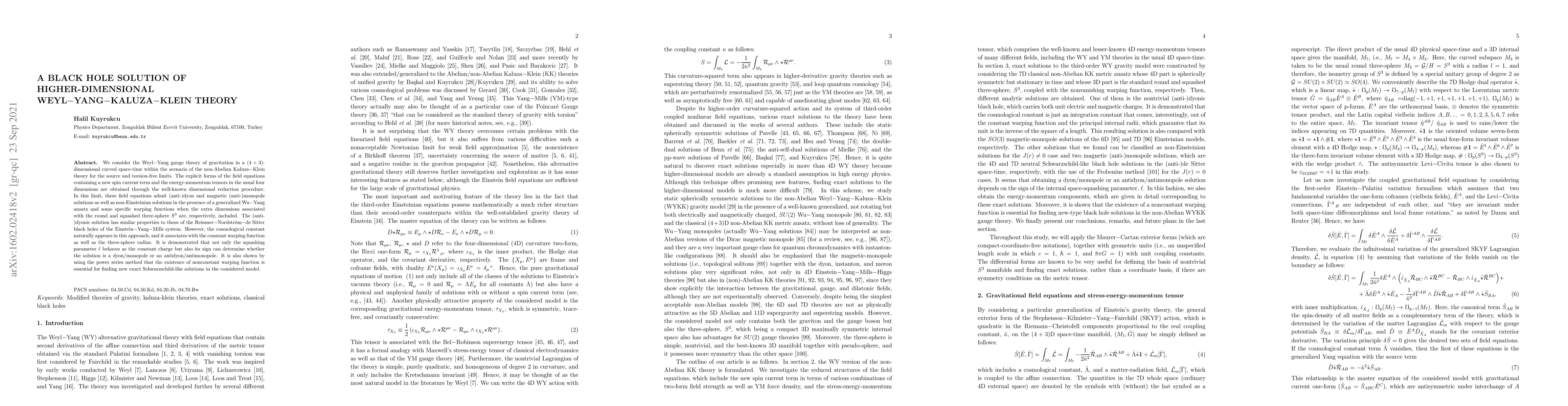 We consider the Weyl$-$Yang gauge theory of gravitation in a $(4+3)$-dimensional curved space-time within the scenario of the non-Abelian Kaluza$-$Klein theory for the source and torsion-free limits. The explicit forms of the field equations containing a new spin current term and the energy-momentum tensors in the usual four dimensions are obtained through the well-known dimensional reduction procedure. In this limit, these field equations admit (anti-)dyon and magnetic (anti-)monopole solutions as well as non-Einsteinian solutions in the presence of a generalized Wu$-$Yang ansatz and some specific warping functions when the extra dimensions associated with the round and squashed three-sphere $S^{3}$ are, respectively, included. The (anti-)dyonic solution has similar properties to those of the Reissner$-$Nordstr\"{o}m$-$de Sitter black holes of the Einstein$-$Yang$-$Mills system. However, the cosmological constant naturally appears in this approach, and it associates with the constant warping function as well as the three-sphere radius. It is demonstrated that not only the squashing parameter $\ell$ behaves as the constant charge but also its sign can determine whether the solution is a dyon/monopole or an antidyon/antimonopole. It is also shown by using the power series method that the existence of nonconstant warping function is essential for finding new exact Schwarzschild-like solutions in the considered model.