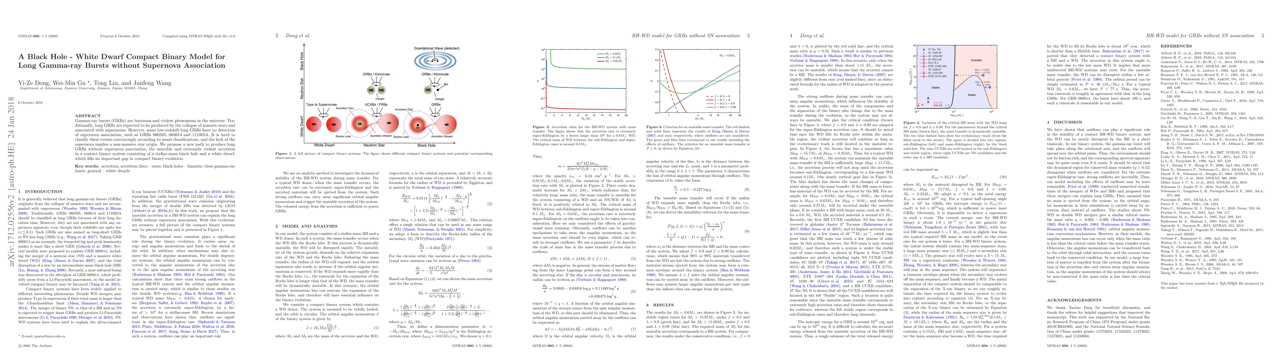This paper proposes a new model for long gamma-ray bursts (GRBs) that do not associate with supernovae, suggesting that such events may originate from the unstable accretion in a compact binary system of a black hole and a white dwarf. This model fills a gap in understanding GRBs without the typical massive star collapse.