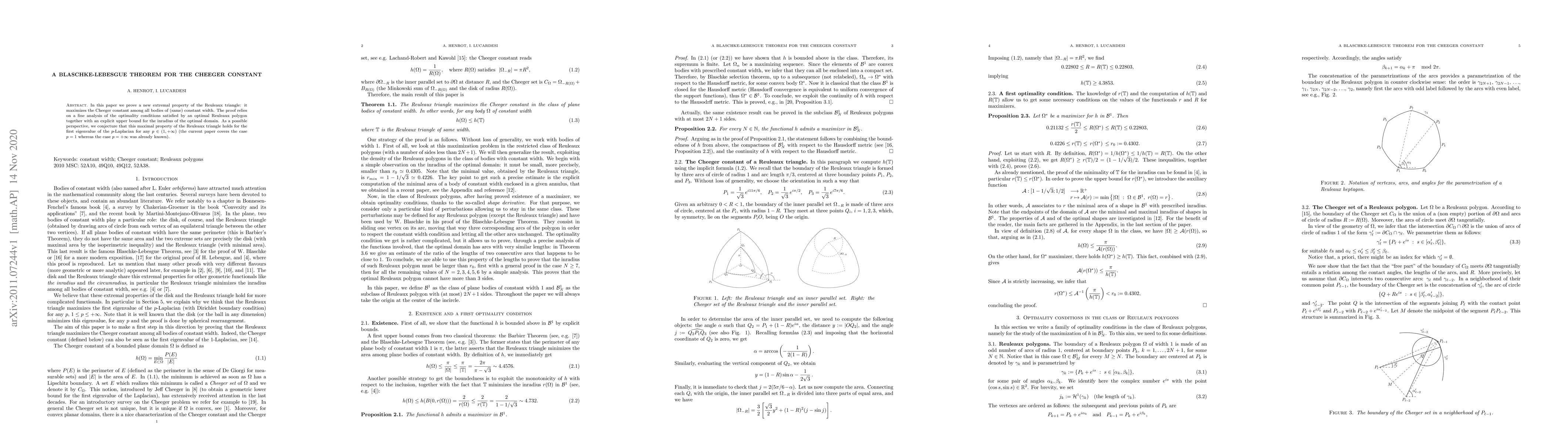 This paper proves that the Reuleaux triangle maximizes the Cheeger constant among all bodies of constant width, using an analysis of optimality conditions and an upper bound for the inradius. The authors also conjecture that the Reuleaux triangle holds this maximal property for the first eigenvalue of the $p$-Laplacian for any $p\in (1,+\infty)$.