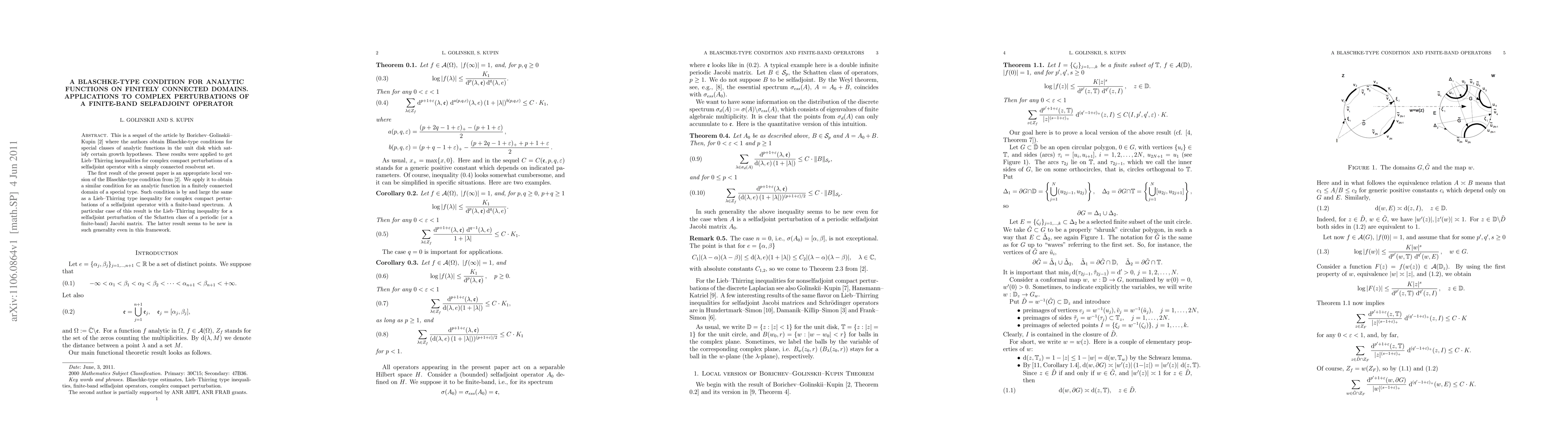 This is a sequel of a recent article by Borichev-Golinskii-Kupin, where the authors obtain Blaschke-type conditions for special classes of analytic functions in the unit disk which satisfy certain growth hypotheses. These results were applied to get Lieb-Thirring inequalities for complex compact perturbations of a selfadjoint operator with a simply connected resolvent set. The first result of the present paper is an appropriate local version of the Blaschke-type condition from Borichev-Golinskii-Kupin. We apply it to obtain a similar condition for an analytic function in a finitely connected domain of a special type. Such condition is by and large the same as a Lieb-Thirring type inequality for complex compact perturbations of a selfadjoint operator with a finite-band spectrum. A particular case of this result is the Lieb-Thirring inequality for a selfadjoint perturbation of the Schatten class of a periodic (or a finite-band) Jacobi matrix. The latter result seems to be new in such generality even in this framework.