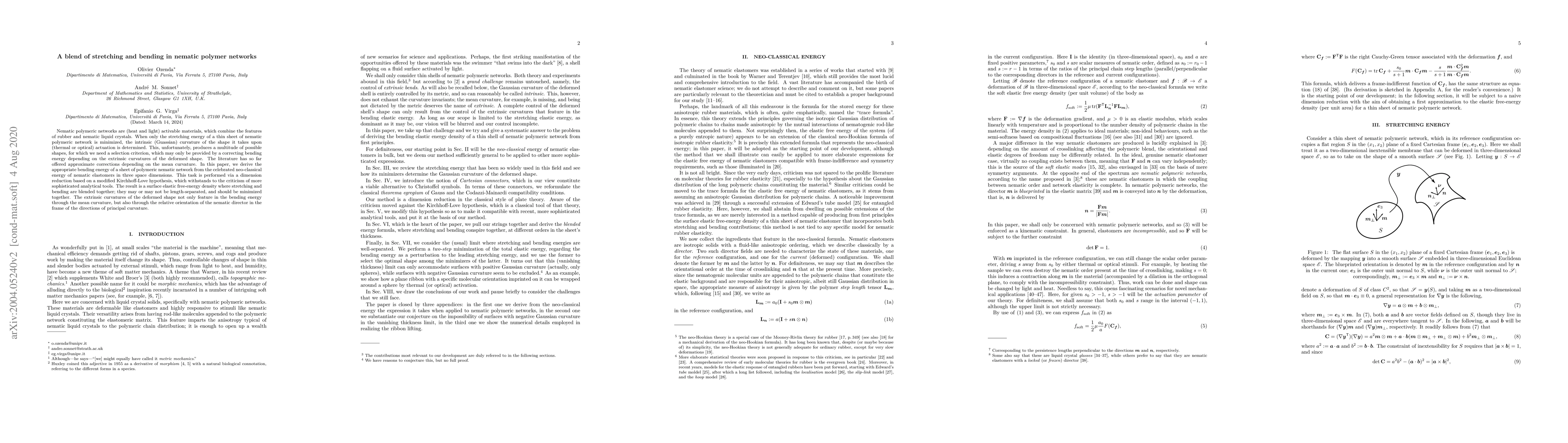 Nematic polymeric networks are (heat and light) activable materials, which combine the features of rubber and nematic liquid crystals. When only the stretching energy of a thin sheet of nematic polymeric network is minimized, the intrinsic (Guassian) curvature of the shape it takes upon (thermal or optical) actuation is determined. This, unfortunately, produces a multitude of possible shapes, for which we need a selection criterion, which may only be provided by a correcting bending energy depending on the extrinsic curvatures of the deformed shape. The literature has so far offered approximate corrections depending on the mean curvature. In this paper, we derive the appropriate bending energy of a sheet of polymeric nematic network from the celebrated neo-classical energy of nematic elastomers in three space dimensions. This task is performed via a dimension reduction based on a modified Kirchhoff-Love hypothesis, which withstands to the criticism of more sophisticated analytical tools. The result is a surface elastic free-energy density where stretching and bending are blended together; they may or may not be length-separated, and should be minimized together. The extrinsic curvatures of the deformed shape not only feature in the bending energy through the mean curvature, but also through the relative orientation of the nematic director in the frame of the directions of principal curvature.