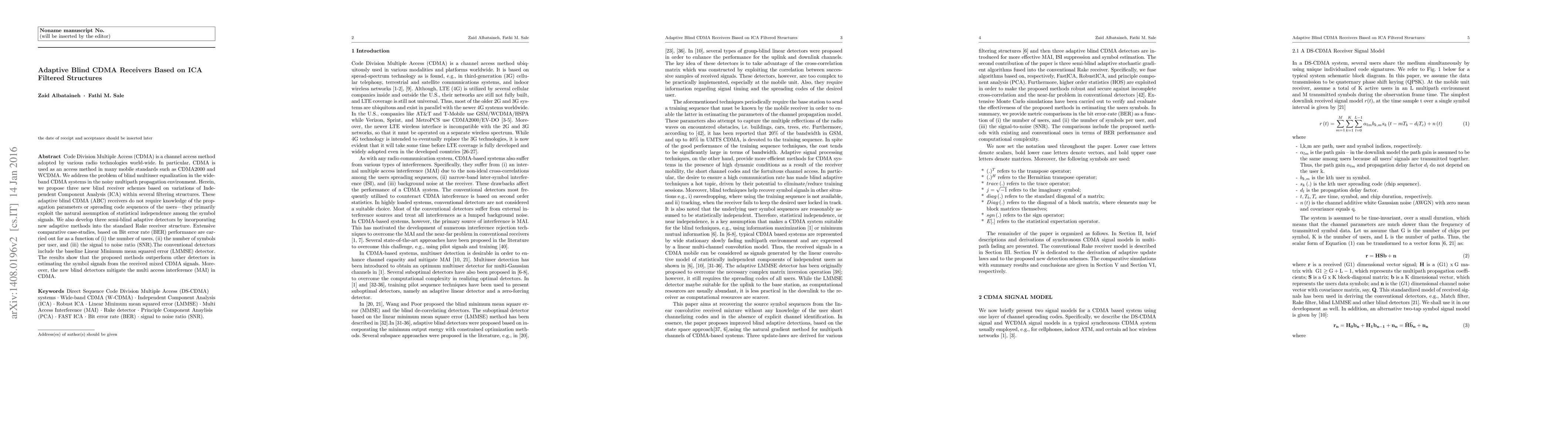 This paper proposes three novel blind adaptive CDMA receiver schemes based on state space structures and Independent Component Analysis (ICA) to address multiuser equalization in noisy multipath environments. The proposed blind state-space receivers (BSSR) outperform conventional detectors in terms of Bit error rate (BER) and mitigate multi access interference (MAI) without requiring knowledge of propagation parameters or spreading code sequences.