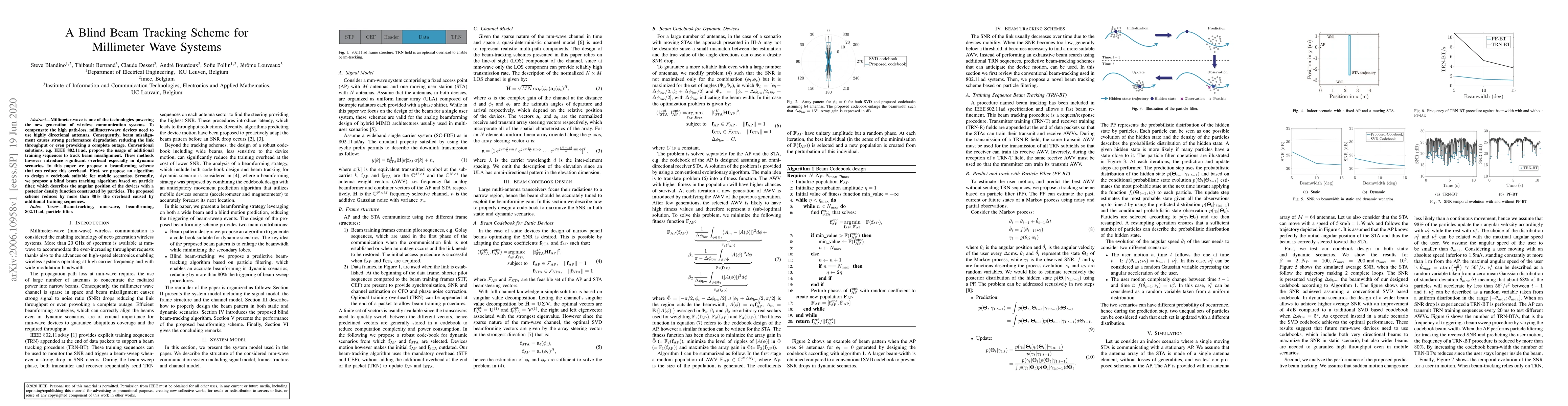 This paper presents a novel beam tracking scheme for millimeter wave systems, addressing the issue of beam misalignment causing performance degradation. The proposed method includes a codebook design for mobile scenarios and a particle filter-based blind beam tracking algorithm, significantly reducing overhead from additional training sequences by more than 80%.