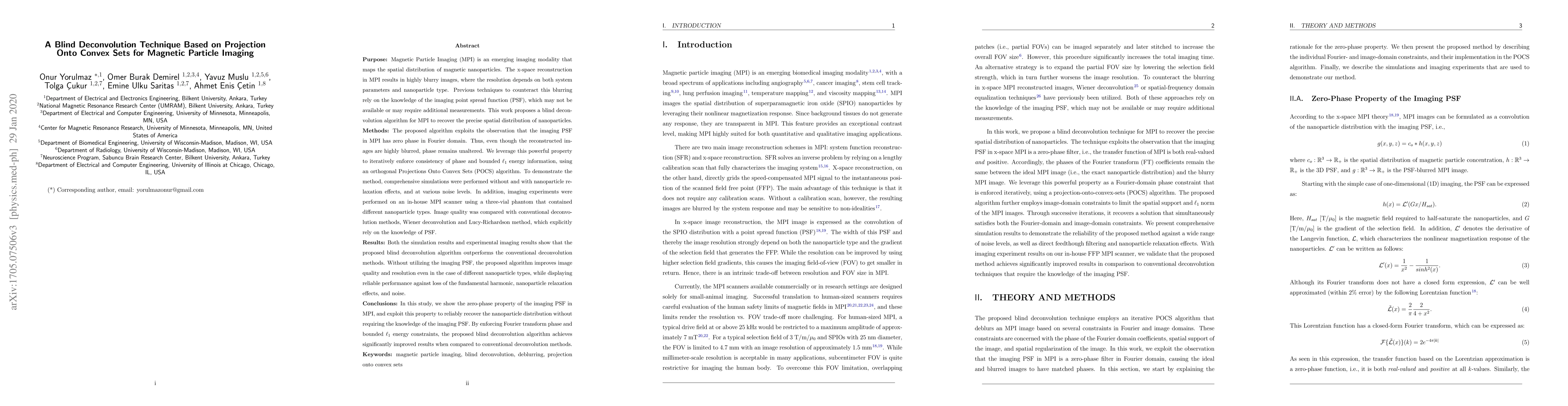 This paper proposes a blind deconvolution technique for Magnetic Particle Imaging (MPI) that leverages the zero-phase property of the imaging PSF in the Fourier domain to recover nanoparticle distributions without requiring prior knowledge of the PSF. The method uses an iterative Projections Onto Convex Sets (POCS) algorithm, demonstrating superior performance over conventional deconvolution methods in both simulations and in-house imaging experiments.