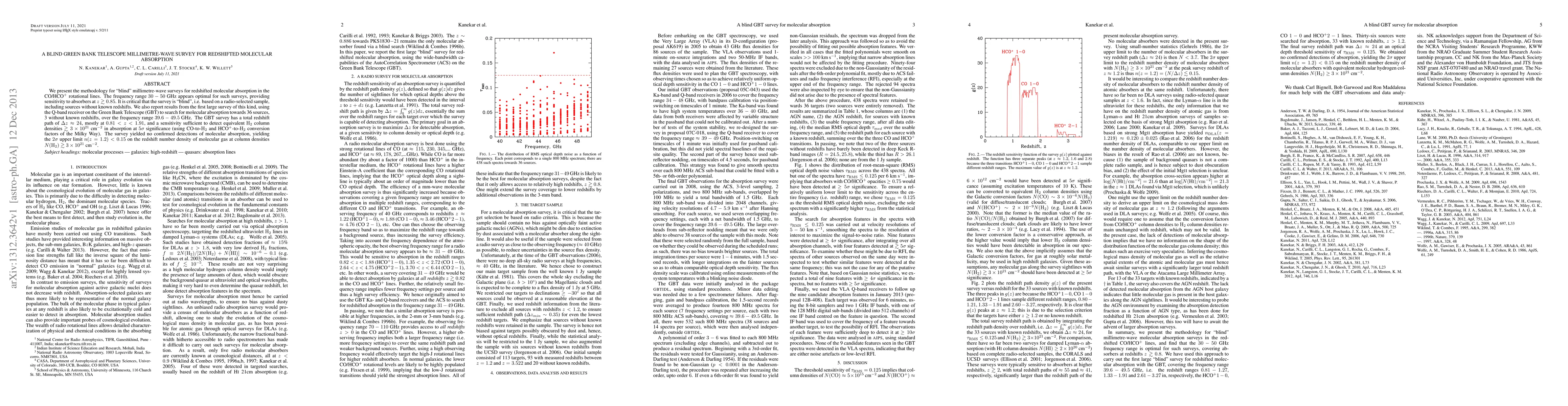 We present the methodology for ``blind'' millimetre-wave surveys for redshifted molecular absorption in the CO/HCO$^+$ rotational lines. The frequency range $30-50$ GHz appears optimal for such surveys, providing sensitivity to absorbers at $z \gtrsim 0.85$. It is critical that the survey is ``blind'', i.e. based on a radio-selected sample, including sources without known redshifts. We also report results from the first large survey of this kind, using the Q-band receiver on the Green Bank Telescope (GBT) to search for molecular absorption towards 36 sources, 3 without known redshifts, over the frequency range $39.6 - 49.5$ GHz. The GBT survey has a total redshift path of $\Delta z \approx 24$, mostly at $0.81 < z < 1.91$, and a sensitivity sufficient to detect equivalent ${\rm H_2}$ column densities $\gtrsim 3 \times 10^{21}$ cm$^{-2}$ in absorption at $5\sigma$ significance (using the CO-to-${\rm H_2}$ and HCO$^+$-to-${\rm H_2}$ conversion factors of the Milky Way). The survey yielded no confirmed detections of molecular absorption, yielding the $2\sigma$ upper limit $n(z=1.2) < 0.15$ on the redshift number density of molecular gas at column densities $N({\rm H_2}) \gtrsim 3 \times 10^{21}$ cm$^{-2}$.
