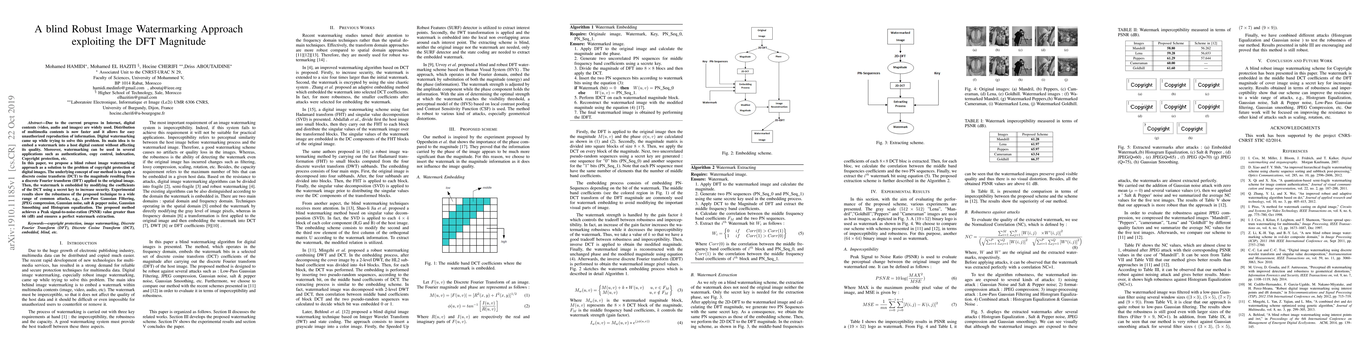 This paper proposes a blind robust image watermarking technique using a combination of DFT magnitude and DCT to embed a watermark in digital images for copyright protection. The method demonstrates high robustness against various attacks and maintains high image quality with a PSNR greater than 66 dB.