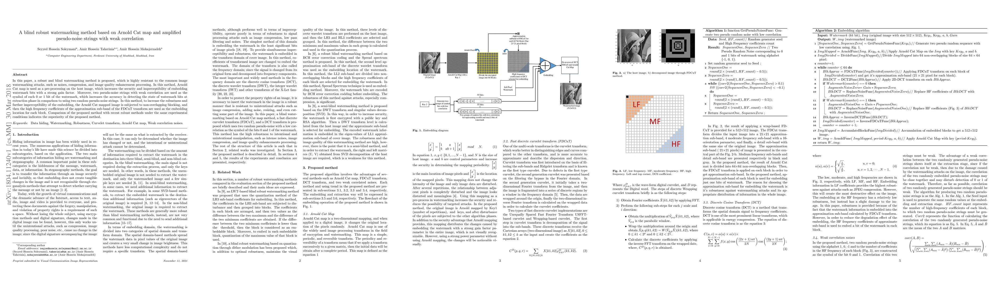 This paper proposes a robust and blind watermarking method using Arnold Cat map and amplified pseudo-noise strings for enhanced security and imperceptibility. The method demonstrates superior robustness against common attacks compared to recent methods, utilizing FDCuT transform for precise watermark extraction.