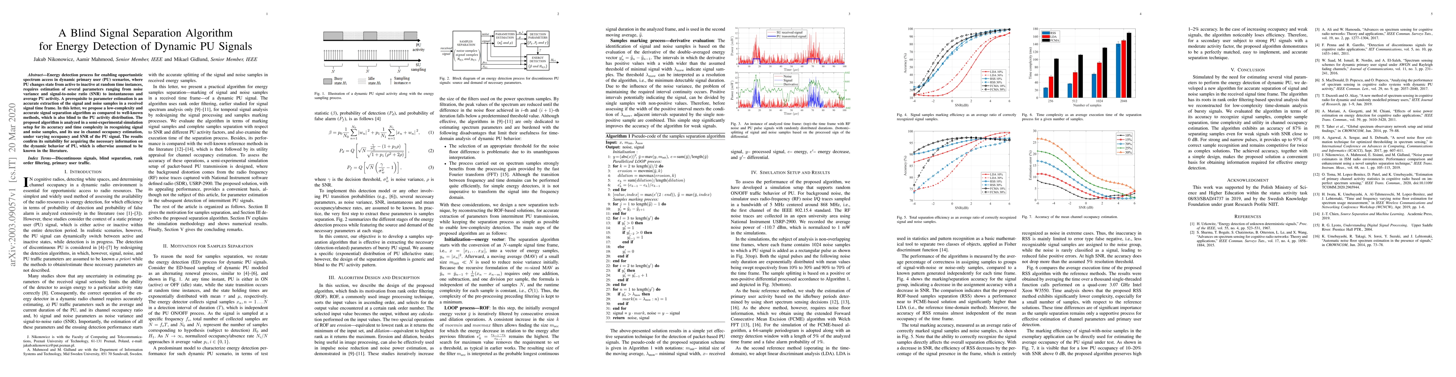 Energy detection process for enabling opportunistic spectrum access in dynamic primary user (PU) scenarios, where PU changes state from active to inactive at random time instances, requires estimation of several parameters ranging from noise variance and signal-to-noise ratio (SNR) to instantaneous and average PU activity. A prerequisite to parameter estimation is an accurate extraction of the signal and noise samples in a received signal time frame. In this letter, we propose a low-complexity and accurate signal separation algorithm as compared to well-known methods, which is also blind to the PU activity distribution. The proposed algorithm is analyzed in a semi-experimental simulation setup for its accuracy and time complexity in recognizing signal and noise samples, and its use in channel occupancy estimation, under varying occupancy and SNR of the PU signal. The results confirm its suitability for acquiring the necessary information on the dynamic behavior of PU, which is otherwise assumed to be known in the literature.