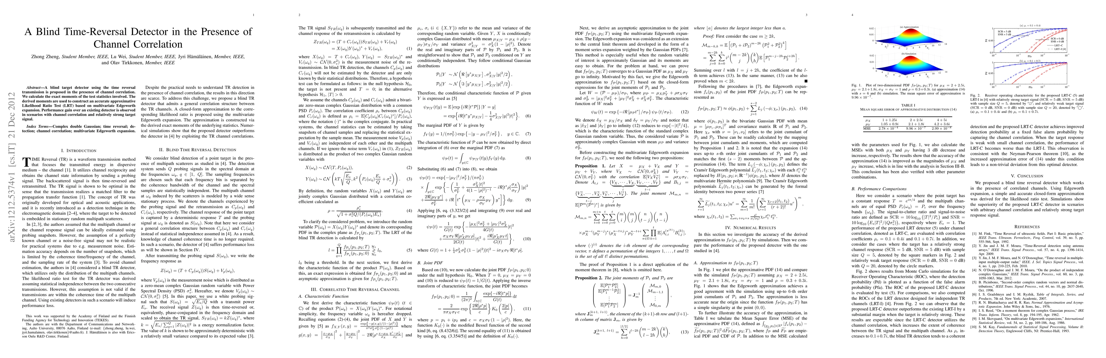 A blind target detector using the time reversal transmission is proposed in the presence of channel correlation. We calculate the exact moments of the test statistics involved. The derived moments are used to construct an accurate approximative Likelihood Ratio Test (LRT) based on multivariate Edgeworth expansion. Performance gain over an existing detector is observed in scenarios with channel correlation and relatively strong target signal.