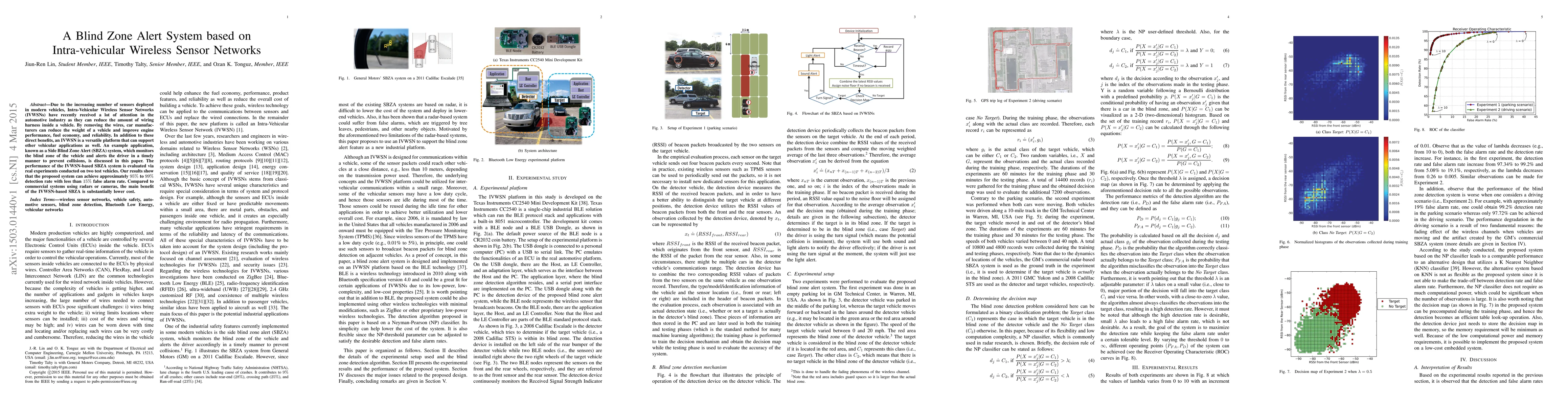 This paper presents a Side Blind Zone Alert system utilizing Intra-Vehicular Wireless Sensor Networks (IVWSNs) to monitor vehicle blind spots, achieving high detection rates and low false alarm rates, while offering a cost-effective alternative to radar or camera-based systems. Real-world experiments on two vehicles demonstrated the system's effectiveness.