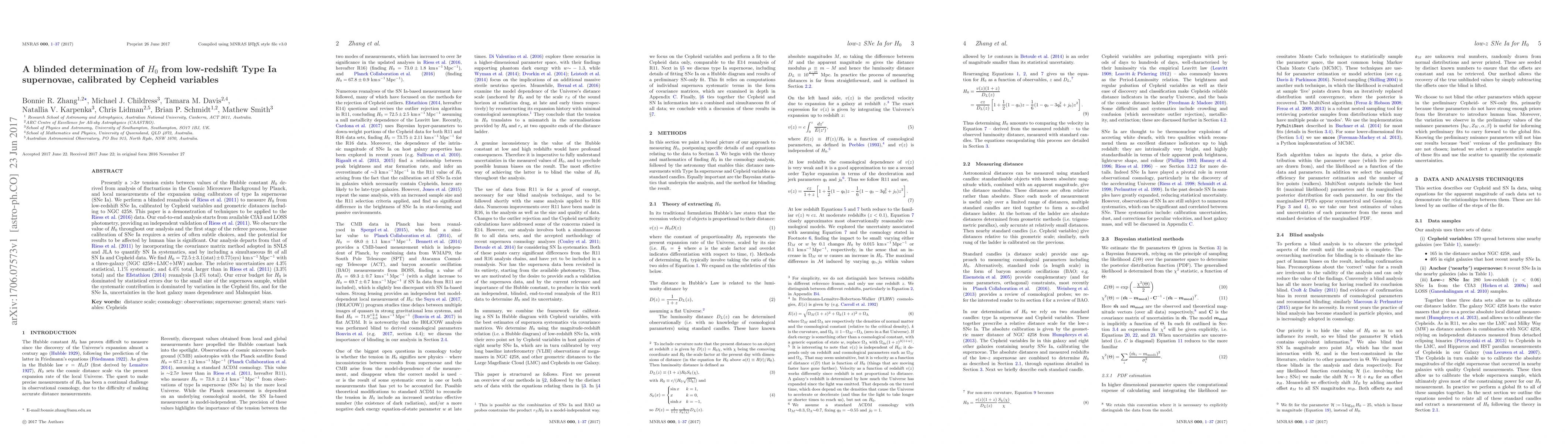 This paper presents a blinded reanalysis of low-redshift Type Ia supernovae calibrated by Cepheid variables to measure the Hubble constant $H_0$, finding $H_0 = 72.5 \pm 3.1$ (stat) $\pm 0.77$ (sys) km s$^{-1}$ Mpc$^{-1}$. The study aims to validate techniques for future analyses and addresses potential biases in the calibration process.