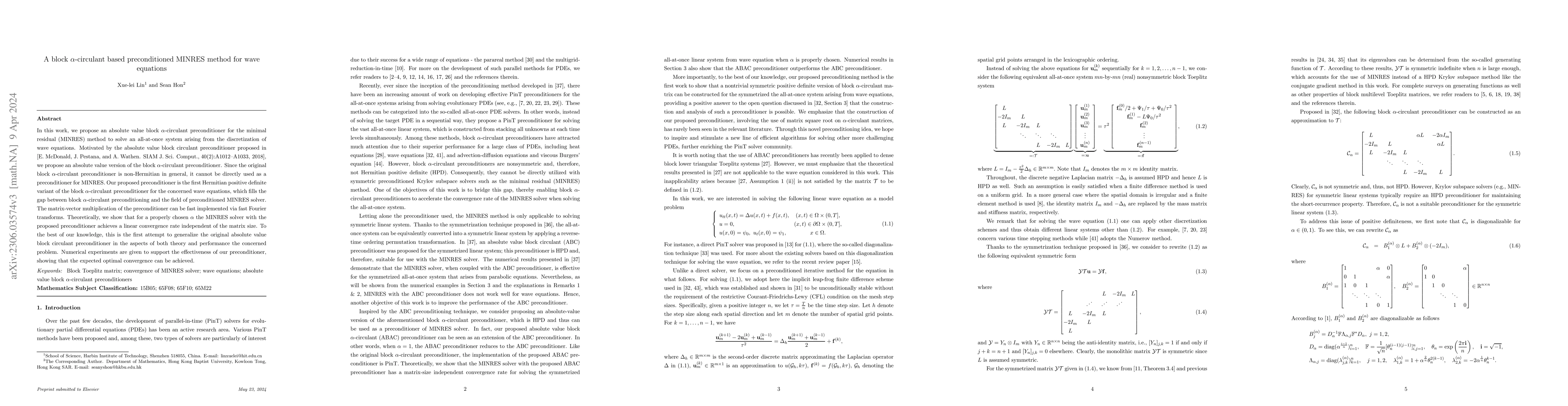 This paper introduces a novel Hermitian positive definite block $\alpha$-circulant preconditioner for the MINRES method to solve wave equation discretizations. The proposed preconditioner, which can be efficiently implemented using fast Fourier transforms, ensures linear convergence of the MINRES solver independent of matrix size, filling a gap in existing preconditioning techniques for wave equations.