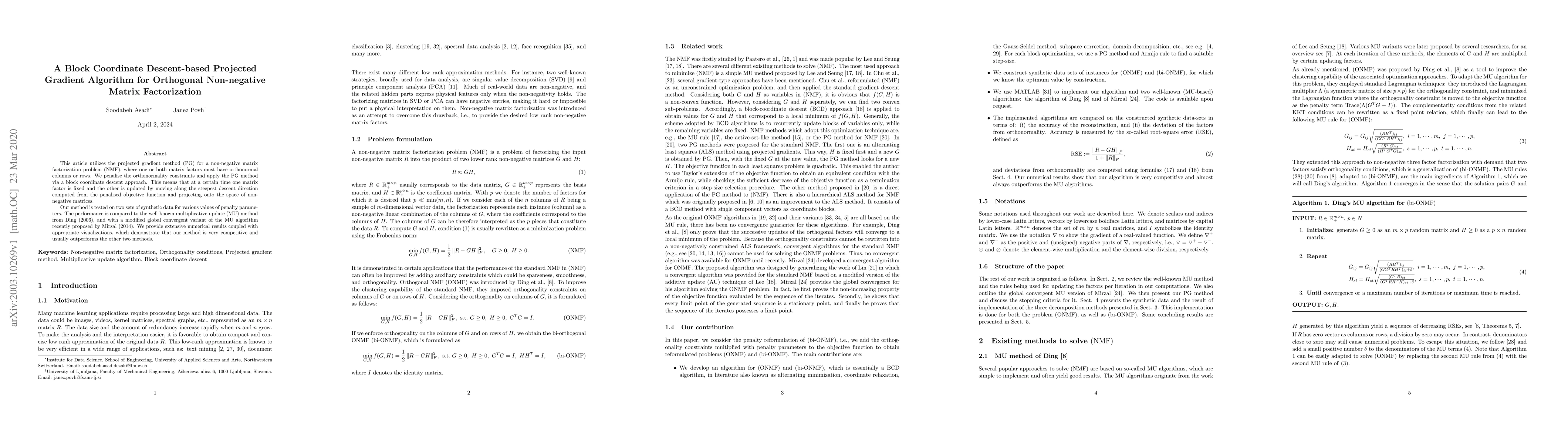 This paper proposes a block coordinate descent-based projected gradient algorithm for orthogonal non-negative matrix factorization, demonstrating competitive performance against the multiplicative update method and a modified variant. The method penalizes orthonormality constraints and updates matrix factors iteratively, showing superior results in synthetic data tests.