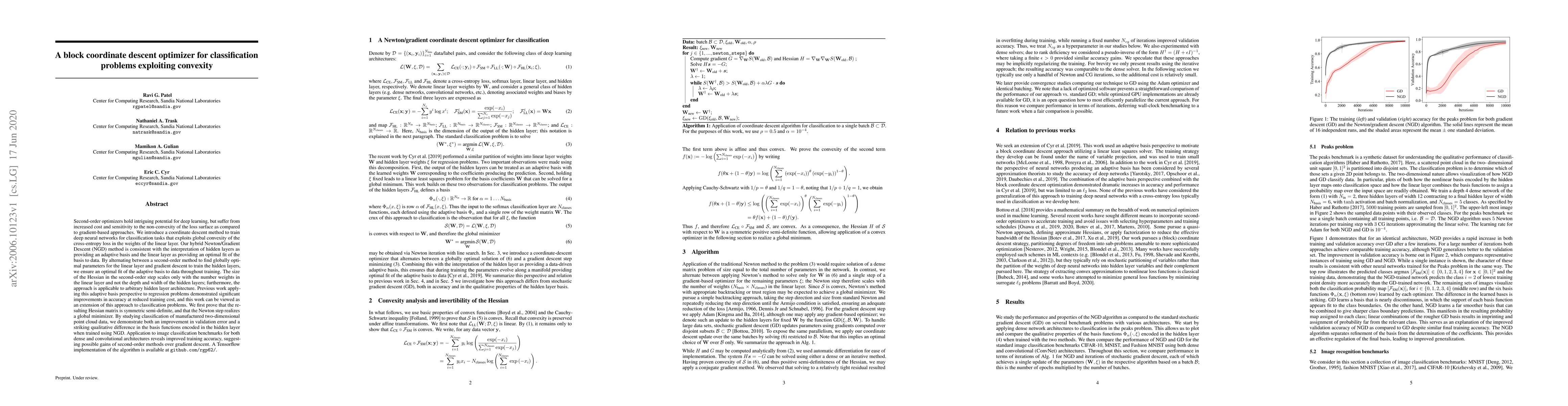 Second-order optimizers hold intriguing potential for deep learning, but suffer from increased cost and sensitivity to the non-convexity of the loss surface as compared to gradient-based approaches. We introduce a coordinate descent method to train deep neural networks for classification tasks that exploits global convexity of the cross-entropy loss in the weights of the linear layer. Our hybrid Newton/Gradient Descent (NGD) method is consistent with the interpretation of hidden layers as providing an adaptive basis and the linear layer as providing an optimal fit of the basis to data. By alternating between a second-order method to find globally optimal parameters for the linear layer and gradient descent to train the hidden layers, we ensure an optimal fit of the adaptive basis to data throughout training. The size of the Hessian in the second-order step scales only with the number weights in the linear layer and not the depth and width of the hidden layers; furthermore, the approach is applicable to arbitrary hidden layer architecture. Previous work applying this adaptive basis perspective to regression problems demonstrated significant improvements in accuracy at reduced training cost, and this work can be viewed as an extension of this approach to classification problems. We first prove that the resulting Hessian matrix is symmetric semi-definite, and that the Newton step realizes a global minimizer. By studying classification of manufactured two-dimensional point cloud data, we demonstrate both an improvement in validation error and a striking qualitative difference in the basis functions encoded in the hidden layer when trained using NGD. Application to image classification benchmarks for both dense and convolutional architectures reveals improved training accuracy, suggesting possible gains of second-order methods over gradient descent.