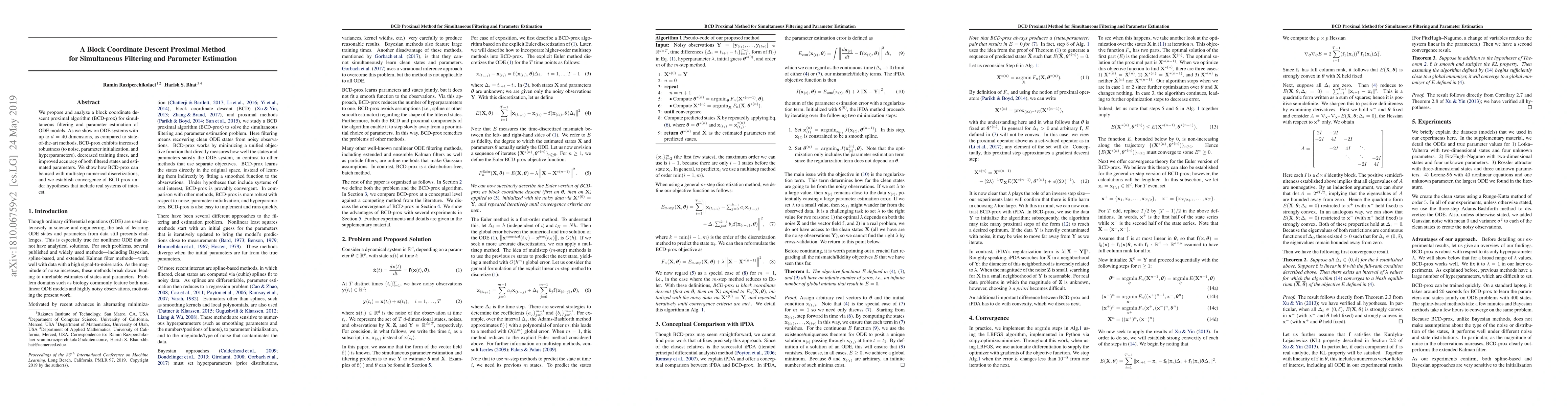 The paper proposes a block coordinate descent proximal algorithm (BCD-prox) for simultaneous filtering and parameter estimation in ODE models, demonstrating increased robustness, reduced training times, and improved accuracy compared to state-of-the-art methods. The method is shown to converge under realistic system hypotheses and can utilize multistep numerical discretizations.