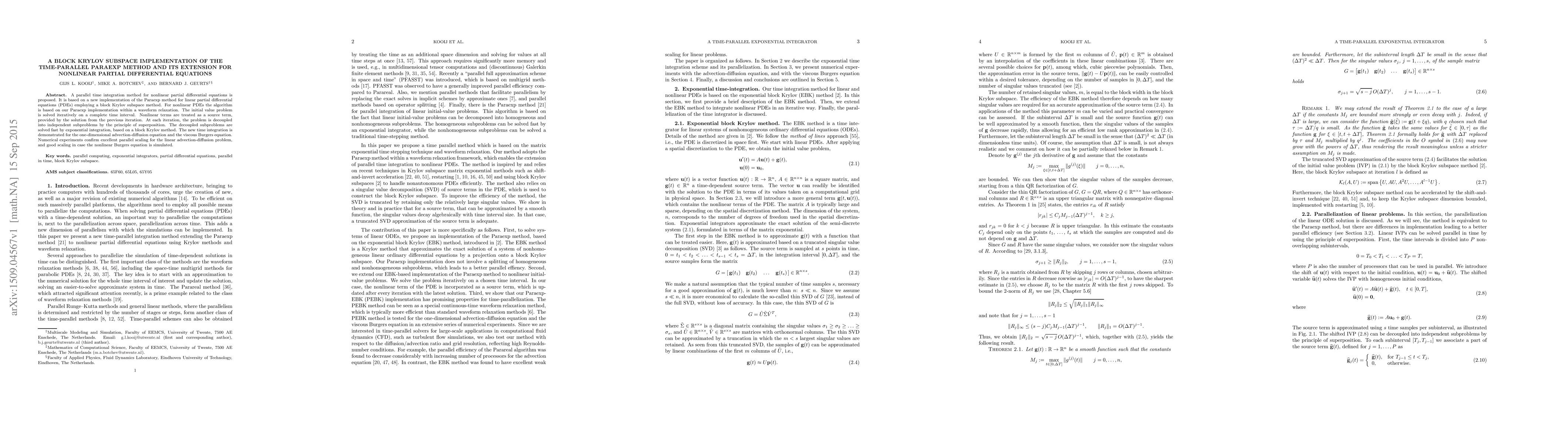 This paper proposes a parallel time integration method for solving nonlinear partial differential equations (PDEs) using a block Krylov subspace implementation of the Paraexp method. It demonstrates excellent parallel scaling for linear problems and good scaling for nonlinear problems, as shown through numerical experiments with the advection-diffusion and Burgers equations.