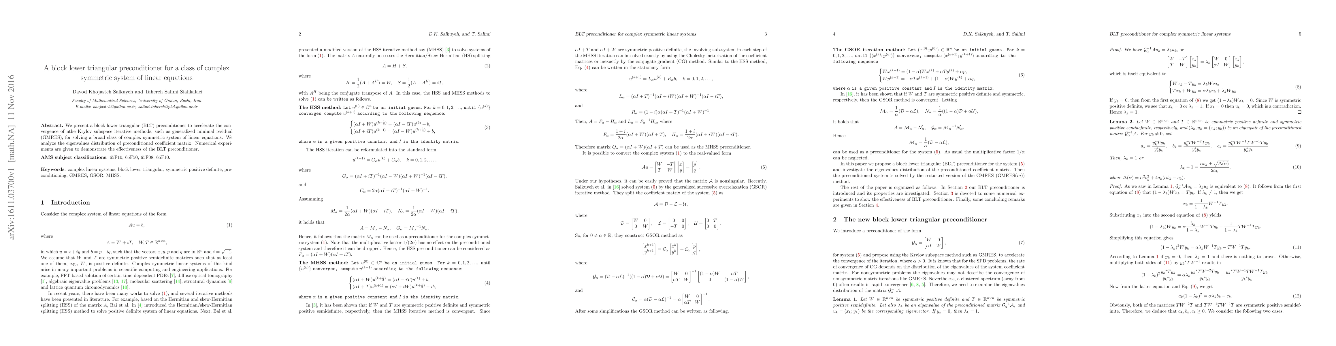 We present a block lower triangular (BLT) preconditioner to accelerate the convergence of nthe Krylov subspace iterative methods, such as generalized minimal residual (GMRES), for solving a broad class of complex symmetric system of linear equations. We analyze the eigenvalues distribution of preconditioned coefficient matrix. Numerical experiments are given to demonstrate the effectiveness of the BLT preconditioner.