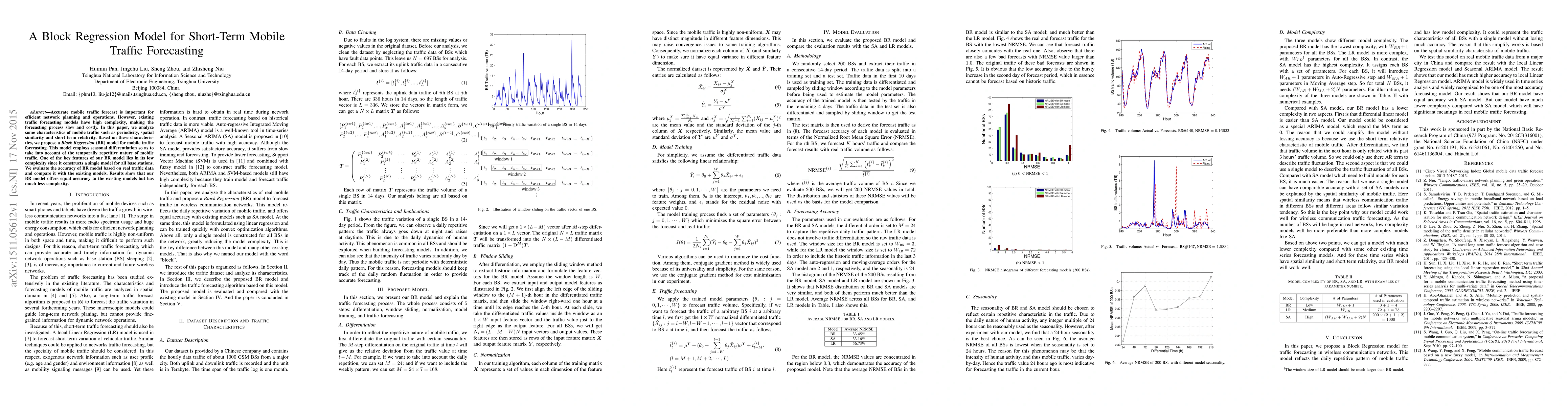 This paper proposes a Block Regression (BR) model for efficient short-term mobile traffic forecasting, leveraging characteristics like periodicity and spatial similarity. The BR model's low complexity allows it to construct a single model for all base stations, achieving comparable accuracy to existing models with significantly reduced computational cost.