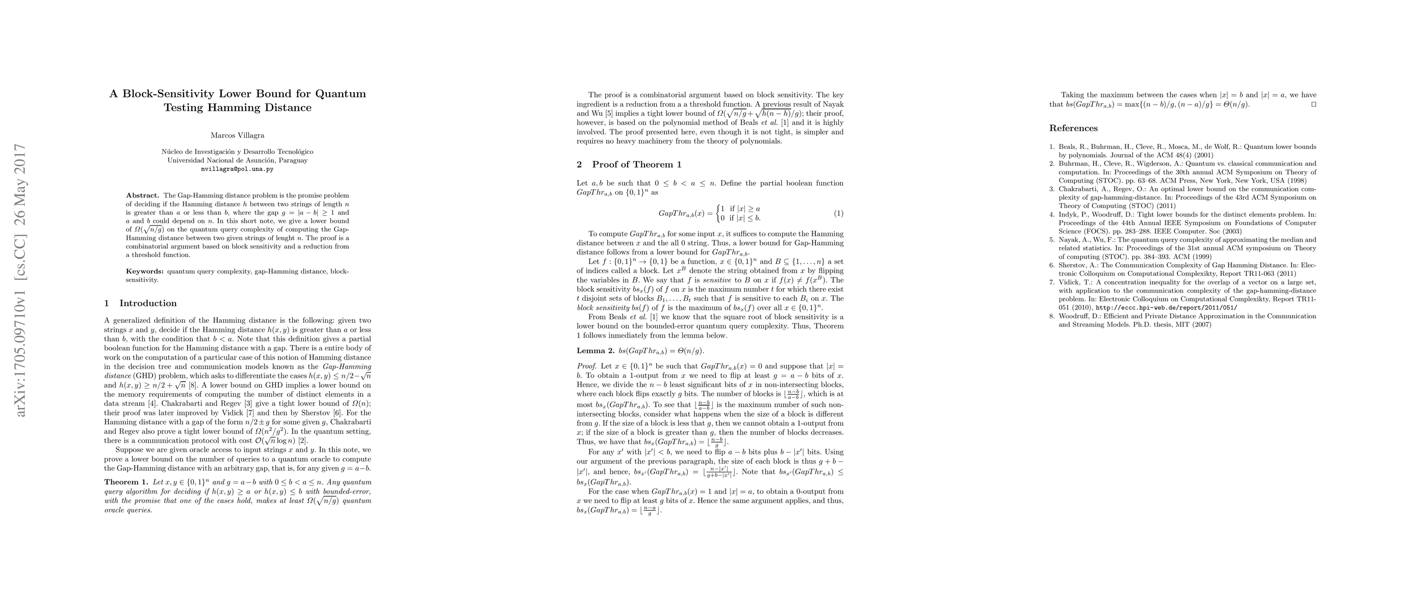 This paper establishes a lower bound of $\Omega(\sqrt{n/g})$ for the quantum query complexity of computing the Gap-Hamming distance, using a combinatorial argument based on block sensitivity and a reduction from a threshold function.