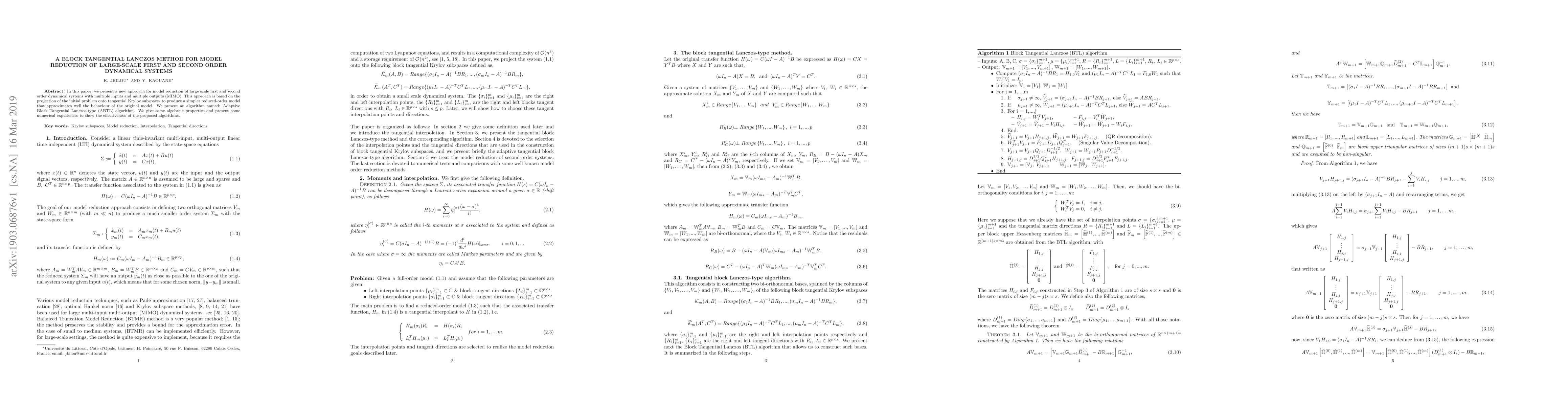 In this paper, we present a new approach for model reduction of large scale first and second order dynamical systems with multiple inputs and multiple outputs (MIMO). This approach is based on the projection of the initial problem onto tangential Krylov subspaces to produce a simpler reduced-order model that approximates well the behavior of the original model. We present an algorithm named: Adaptive Block Tangential Lanczos-type (ABTL) algorithm. We give some algebraic properties and present some numerical experiences to show the effectiveness of the proposed algorithms.