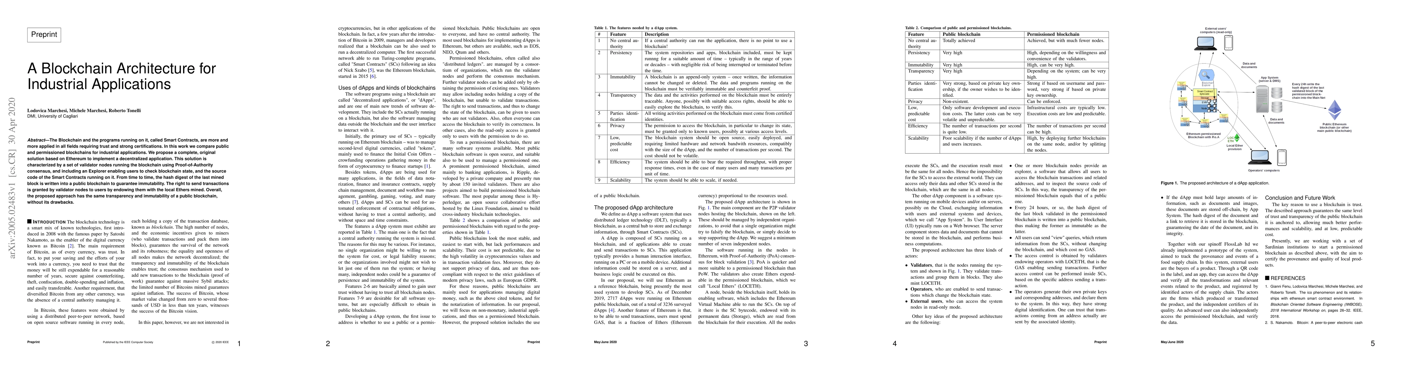 The Blockchain and the programs running on it, called Smart Contracts, are more and more applied in all fields requiring trust and strong certifications. In this work we compare public and permissioned blockchains for industrial applications. We propose a complete, original solution based on Ethereum to implement a decentralized application. This solution is characterized by a set of validator nodes running the blockchain using Proof-of-Authority consensus, and including an Explorer enabling users to check blockchain state, and the source code of the Smart Contracts running on it. From time to time, the hash digest of the last mined block is written into a public blockchain to guarantee immutability. The right to send transactions is granted by validator nodes to users by endowing them with the local Ethers mined. Overall, the proposed approach has the same transparency and immutability of a public blockchain, without its drawbacks.
