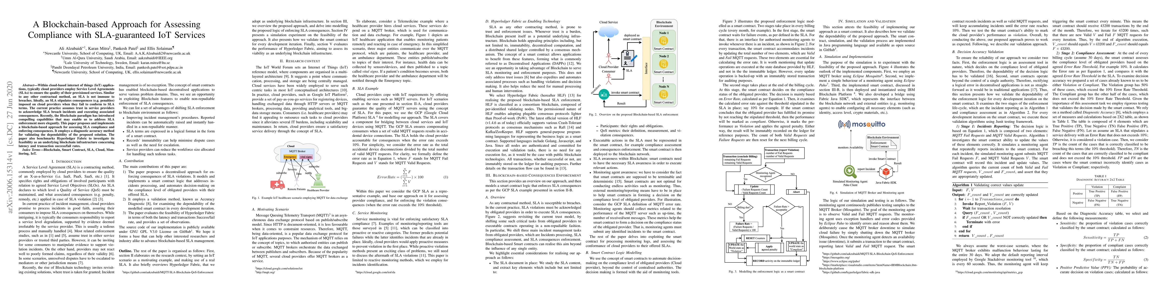 This paper proposes a blockchain-based method to assess compliance with SLA-guaranteed IoT services, leveraging Hyperledger Fabric to enforce penalties for breaches. The approach employs diagnostic accuracy and benchmarks the blockchain's performance in terms of latency and transaction success rates.
