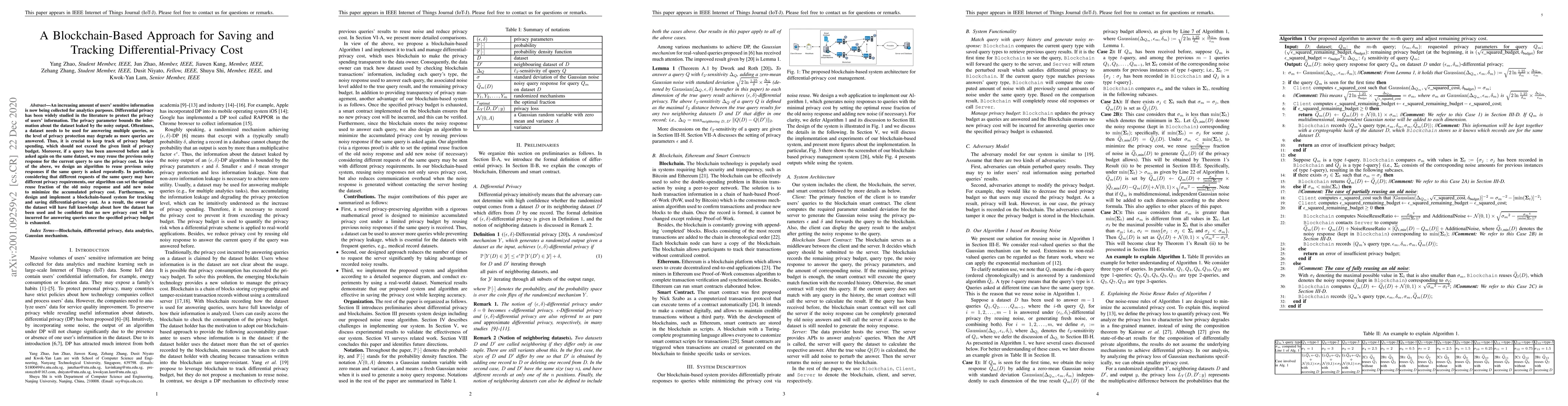 This paper proposes a blockchain-based system to track and manage differential-privacy costs when answering multiple queries on a dataset. The system records each query's details and reuses previous noisy responses to minimize privacy costs, optimizing the balance between privacy and data accuracy.