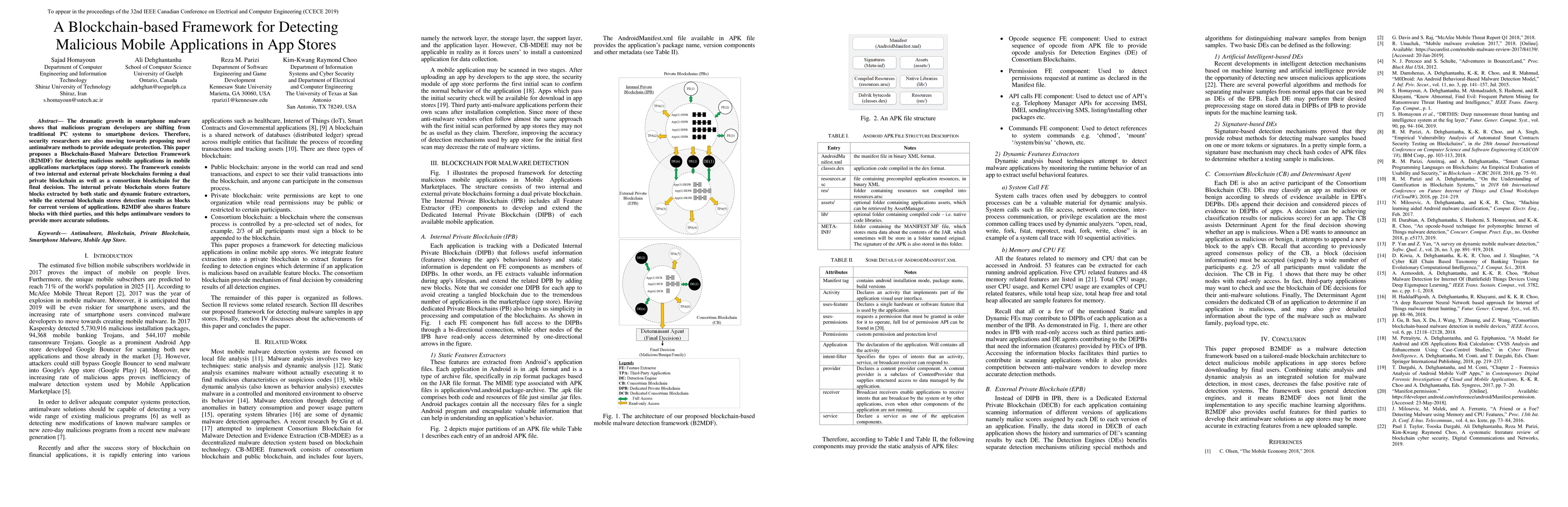 This paper introduces a Blockchain-Based Malware Detection Framework (B2MDF) to identify malicious mobile applications in app stores. It uses a dual private blockchain for feature extraction and a consortium blockchain for final detection decisions, enhancing collaborative antimalware efforts.