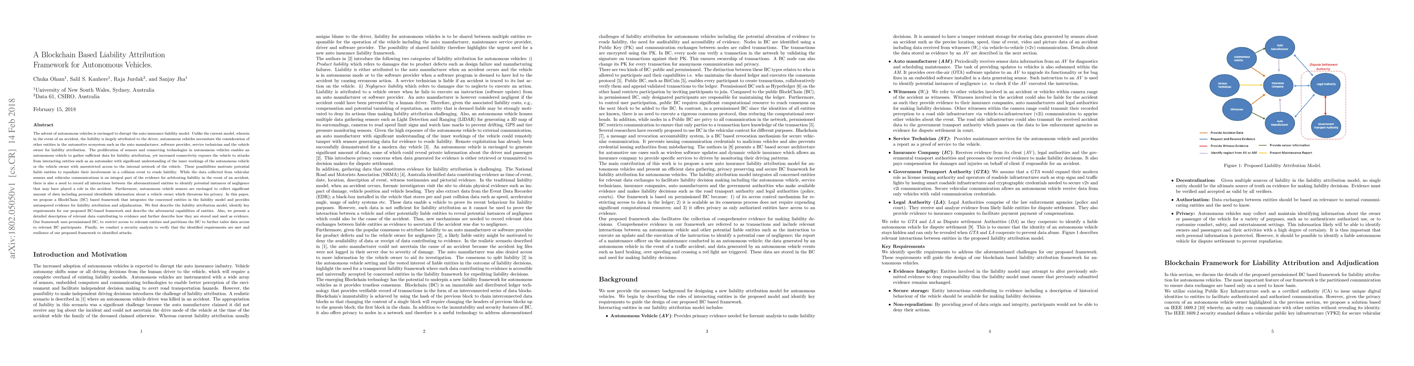 This paper proposes a blockchain-based framework to redefine liability attribution for autonomous vehicles, integrating multiple entities like manufacturers and software providers. It uses a permissioned blockchain to ensure secure and tamper-proof evidence collection and adjudication, addressing potential repudiation of liability by entities.