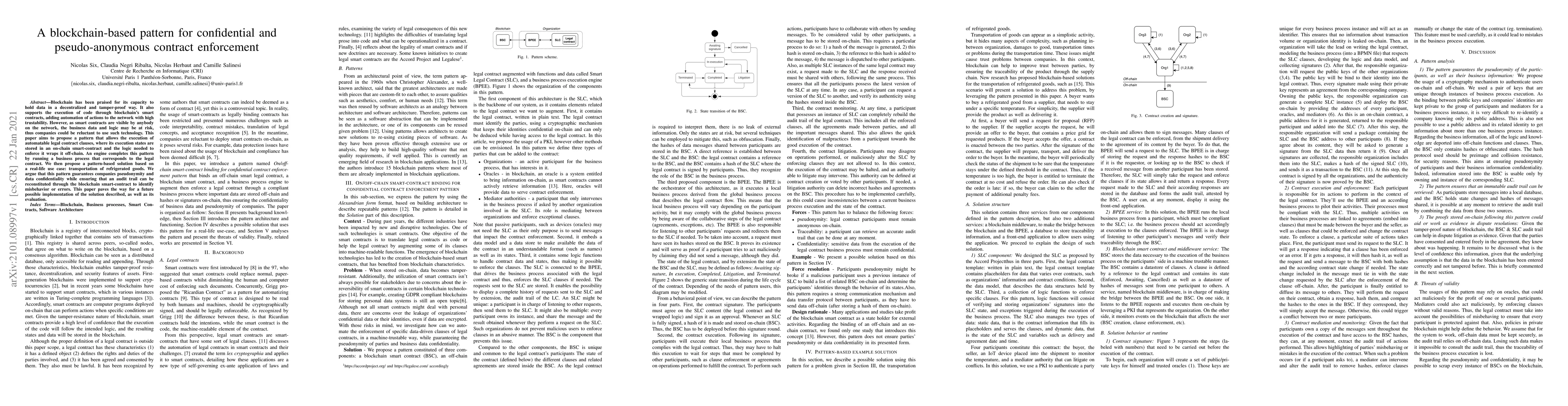 Blockchain has been praised for its capacity to hold data in a decentralized and tamper-proof way. It also supports the execution of code through blockchain's smart contracts, adding automation of actions to the network with high trustability. However, as smart contracts are visible by anybody on the network, the business data and logic may be at risk, thus companies could be reluctant to use such technology. This paper aims to propose a pattern that allows the execution of automatable legal contract clauses, where its execution states are stored in an on-chain smart-contract and the logic needed to enforce it wraps it off-chain. An engine completes this pattern by running a business process that corresponds to the legal contract. We then propose a pattern-based solution based on a real-life use case: transportation of refrigerated goods. We argue that this pattern guarantees companies pseudonymity and data confidentiality while ensuring that an audit trail can be reconstituted through the blockchain smart-contract to identify misbehavior or errors. This paper paves the way for a future possible implementation of the solution described, as well as its evaluation.
