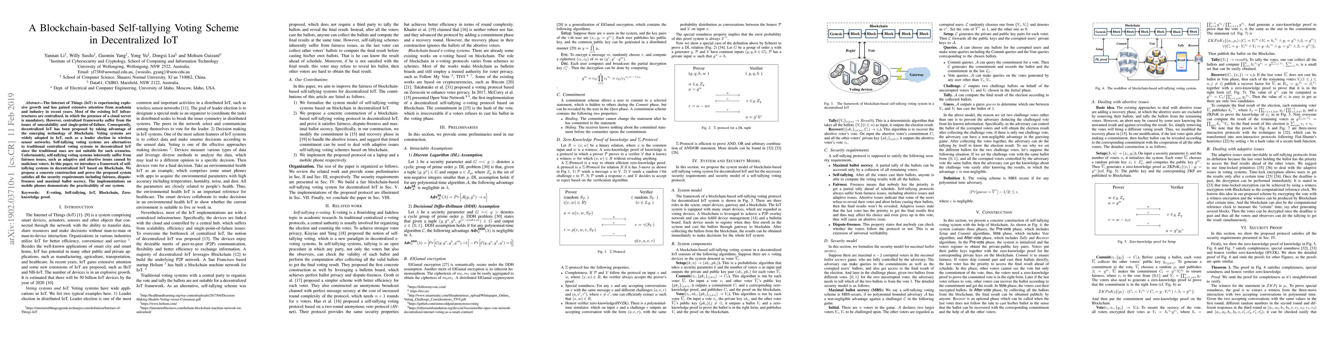 This paper presents a blockchain-based self-tallying voting scheme for decentralized IoT, addressing fairness issues in decentralized voting systems. The proposed framework ensures security requirements like fairness, dispute-freeness, and ballot secrecy, validated through mobile phone implementations.