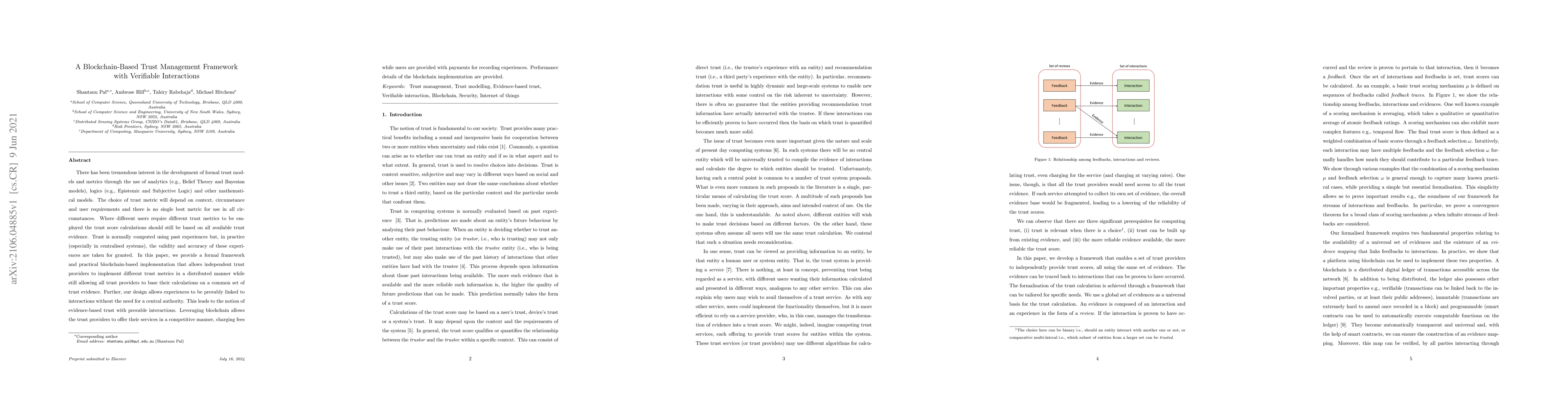 A blockchain-based framework allows independent trust providers to implement different trust metrics while sharing a common set of trust evidence, enabling provably linked interactions and evidence-based trust.