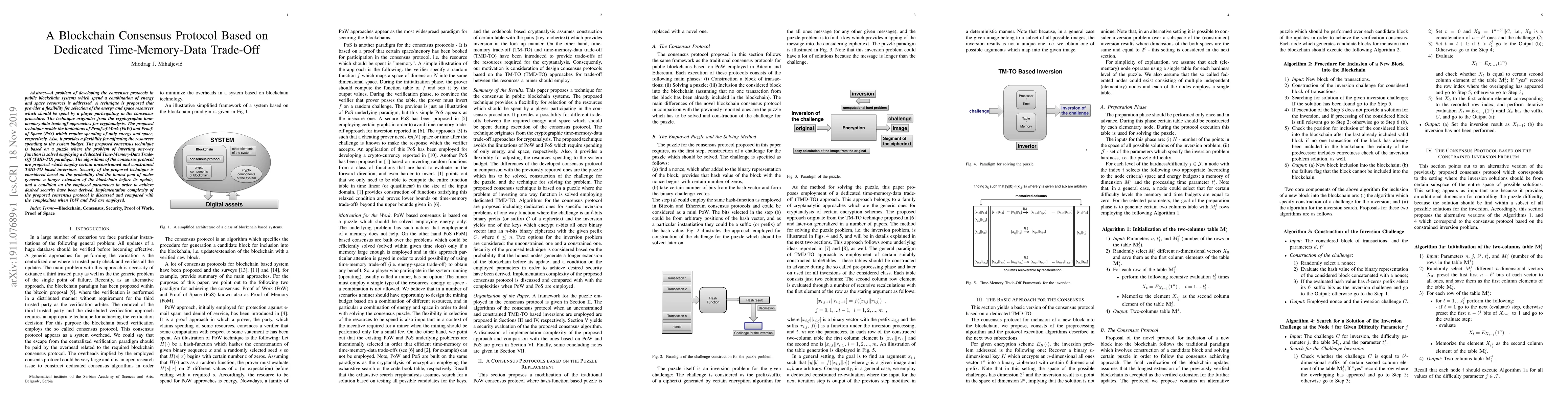 A problem of developing the consensus protocols in public blockchain systems which spend a combination of energy and space resources is addressed. A technique is proposed that provides a flexibility for selection of the energy and space resources which should be spent by a player participating in the consensus procedure. The technique originates from the cryptographic time-memory-data trade-off approaches for cryptanalysis. The proposed technique avoids the limitations of Proof-of-Work (PoW) and Proof-of Space (PoS) which require spending of only energy and space, respectively. Also, it provides a flexibility for adjusting the resources spending to the system budget. The proposed consensus technique is based on a puzzle where the problem of inverting one-way function is solved employing a dedicated Time-Memory-Data Trade-Off (TMD-TO) paradigm. The algorithms of the consensus protocol are proposed which employ certain unconstrained and constrained TMD-TO based inversions. Security of the proposed technique is considered based on the probability that the honest pool of nodes generate a longer extension of the blockchain before its update, and a condition on the employed parameters in order to achieve desired security have been derived. Implementation complexity of the proposed consensus protocol is discussed and compared with the complexities when PoW and PoS are employed.