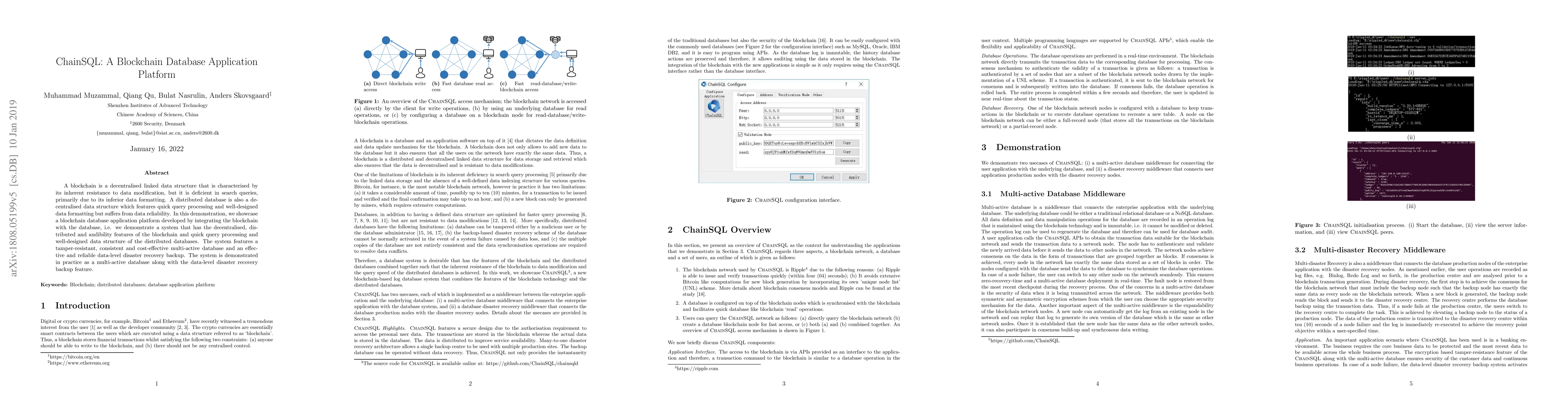 A blockchain is a decentralised linked data structure that is characterised by its inherent resistance to data modification, but it is deficient in search queries, primarily due to its inferior data formatting. A distributed database is also a decentralised data structure which features quick query processing and well-designed data formatting but suffers from data reliability. In this demonstration, we showcase a blockchain database application platform developed by integrating the blockchain with the database, i.e. we demonstrate a system that has the decentralised, distributed and audibility features of the blockchain and quick query processing and well-designed data structure of the distributed databases. The system features a tamper-resistant, consistent and cost-effective multi-active database and an effective and reliable data-level disaster recovery backup. The system is demonstrated in practice as a multi-active database along with the data-level disaster recovery backup feature.