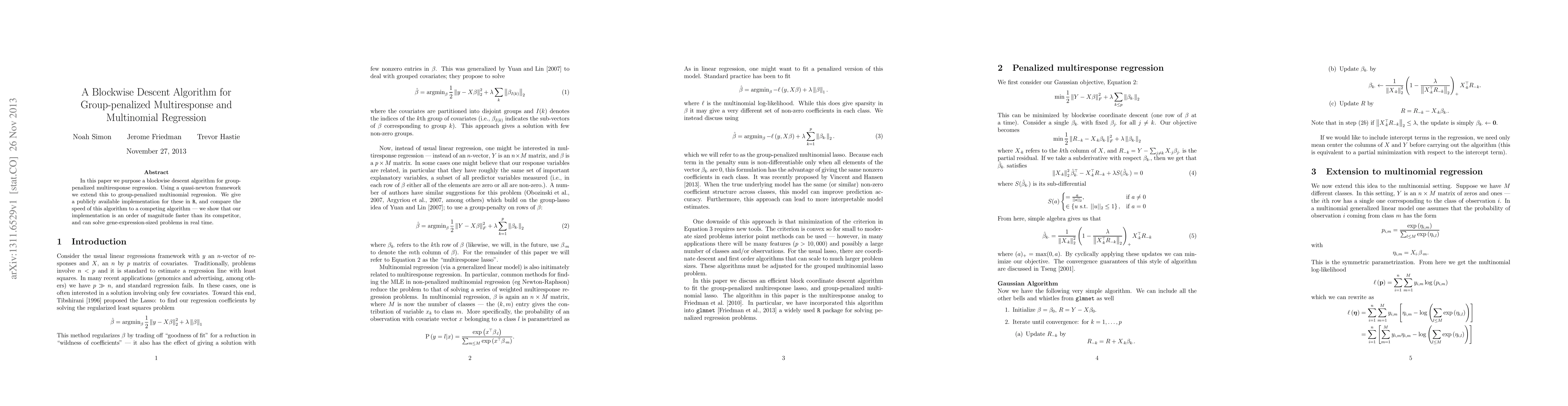 This paper proposes a blockwise descent algorithm for group-penalized multiresponse and multinomial regression, demonstrating its efficiency through a quasi-Newton framework. The authors provide an R implementation and show it is significantly faster than competing algorithms, solving large-scale gene-expression problems in real time.