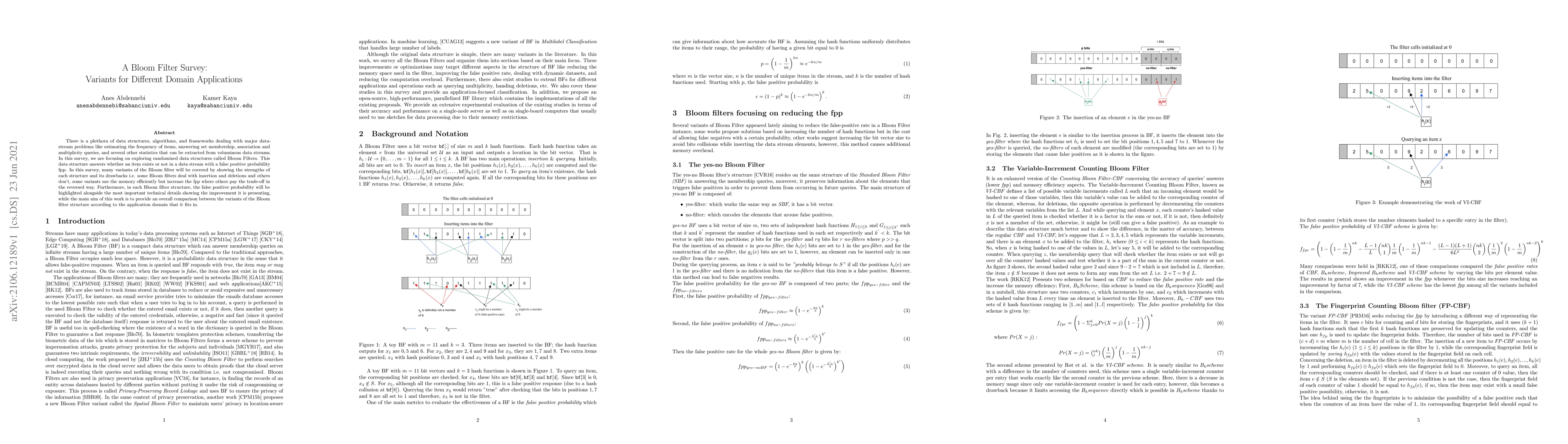There is a plethora of data structures, algorithms, and frameworks dealing with major data-stream problems like estimating the frequency of items, answering set membership, association and multiplicity queries, and several other statistics that can be extracted from voluminous data streams. In this survey, we are focusing on exploring randomized data structures called Bloom Filters. This data structure answers whether an item exists or not in a data stream with a false positive probability fpp. In this survey, many variants of the Bloom filter will be covered by showing the strengths of each structure and its drawbacks i.e. some Bloom filters deal with insertion and deletions and others don't, some variants use the memory efficiently but increase the fpp where others pay the trade-off in the reversed way. Furthermore, in each Bloom filter structure, the false positive probability will be highlighted alongside the most important technical details showing the improvement it is presenting, while the main aim of this work is to provide an overall comparison between the variants of the Bloom filter structure according to the application domain that it fits in.