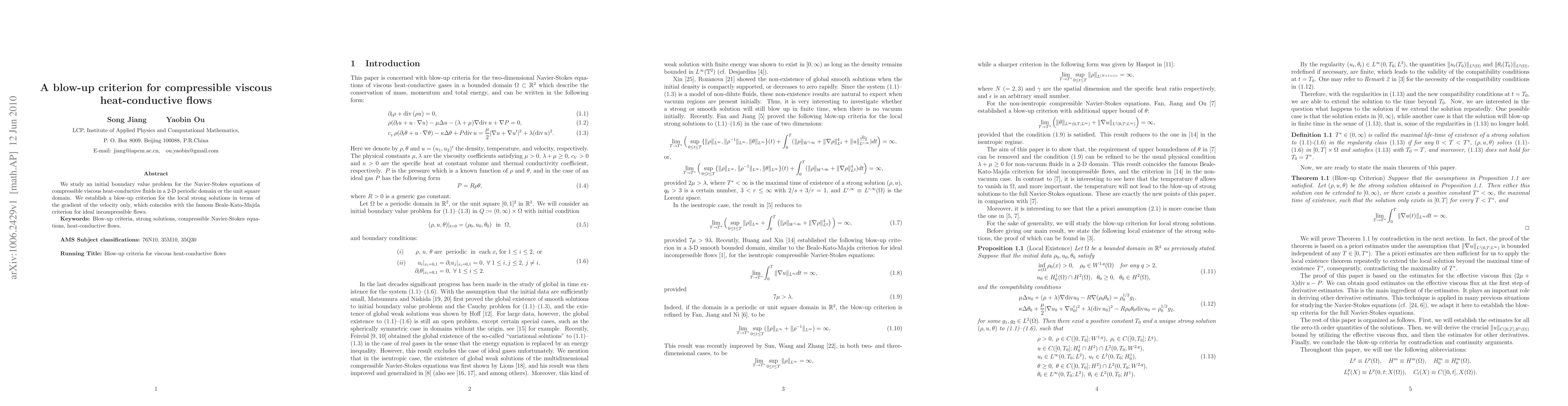 This paper establishes a blow-up criterion for local strong solutions of compressible viscous heat-conductive fluid flows in 2-D domains, showing that the solution may blow up if the gradient of the velocity exceeds a certain threshold, similar to the Beale-Kato-Majda criterion for incompressible flows.