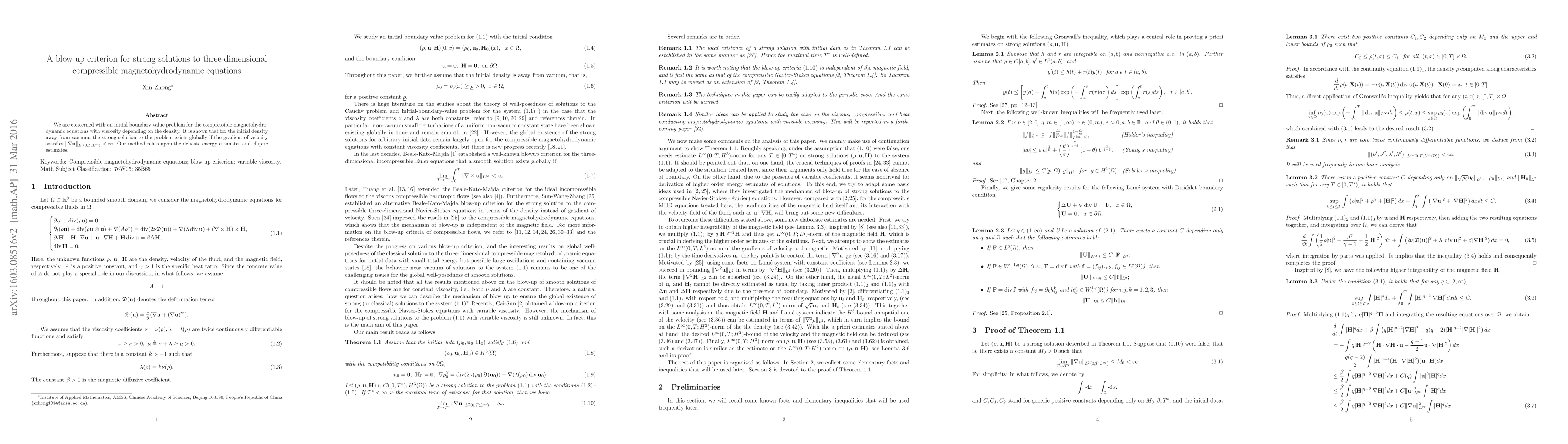 The paper establishes a blow-up criterion for strong solutions to 3D compressible magnetohydrodynamic equations under certain conditions. It shows that if the velocity's gradient remains bounded, then global strong solutions exist.