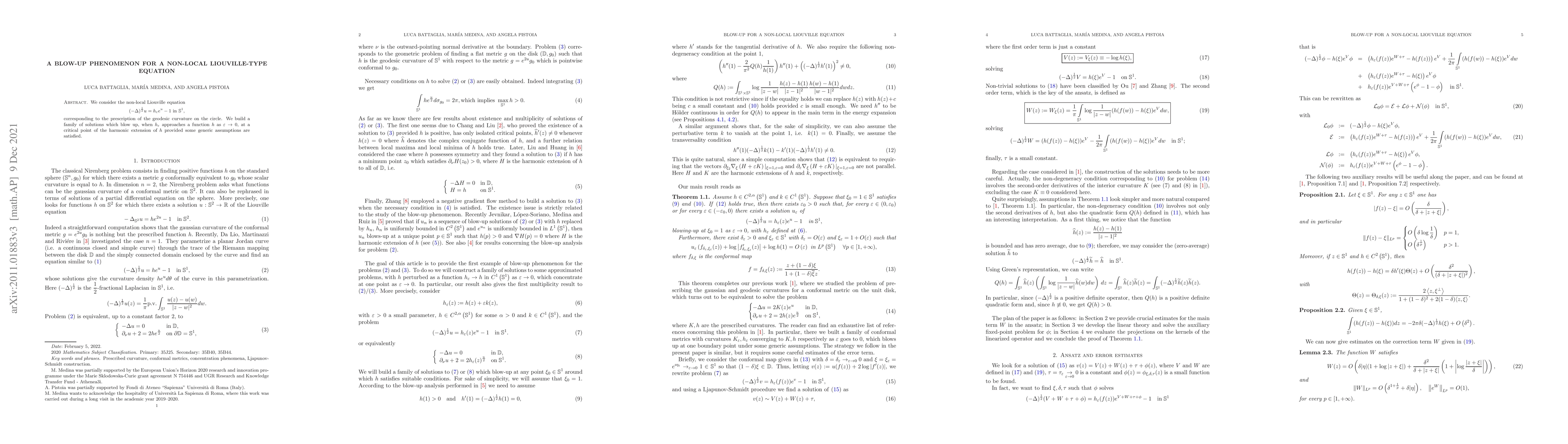 This research presents a family of solutions to a non-local Liouville equation, modeled after geodesic curvature on a circle. These solutions are shown to exhibit a blow-up phenomenon at specific critical points of the harmonic extension of the given curvature function, under certain conditions.