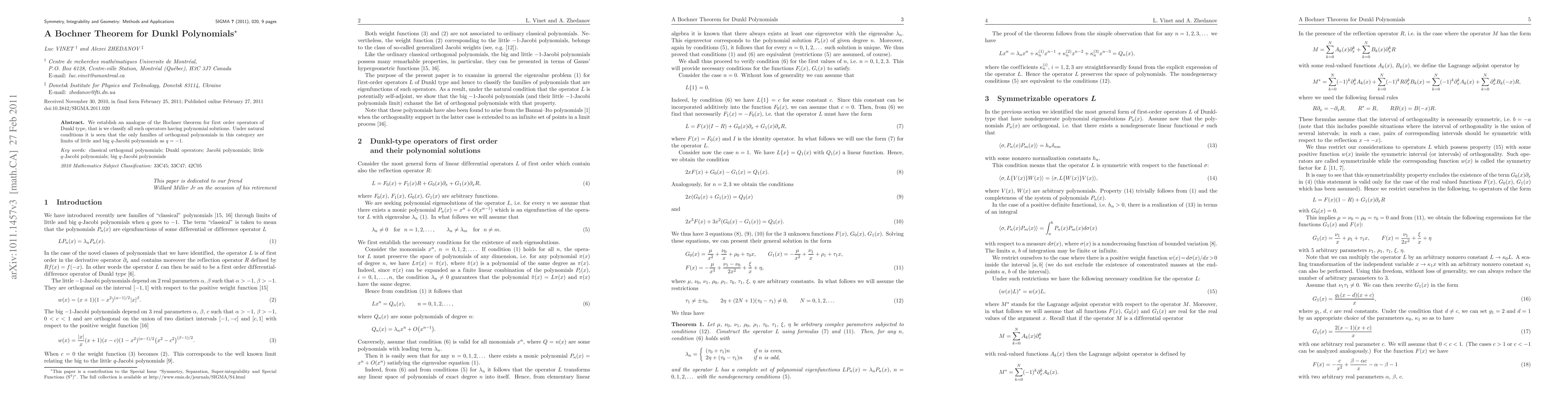 Researchers establish a Bochner theorem for Dunkl polynomials, classifying operators with polynomial solutions, specifically finding that only limits of q-Jacobi polynomials as q=-1 produce orthogonal families.