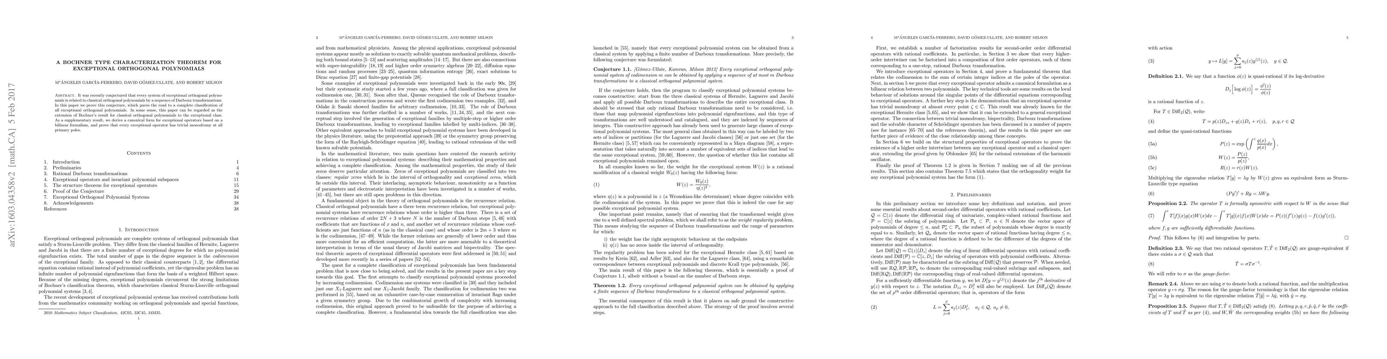This paper proves the conjecture linking exceptional orthogonal polynomials to classical ones via Darboux transformations, extending Bochner's classification theorem. Additionally, it establishes a canonical form for exceptional operators and demonstrates their trivial monodromy at primary poles.