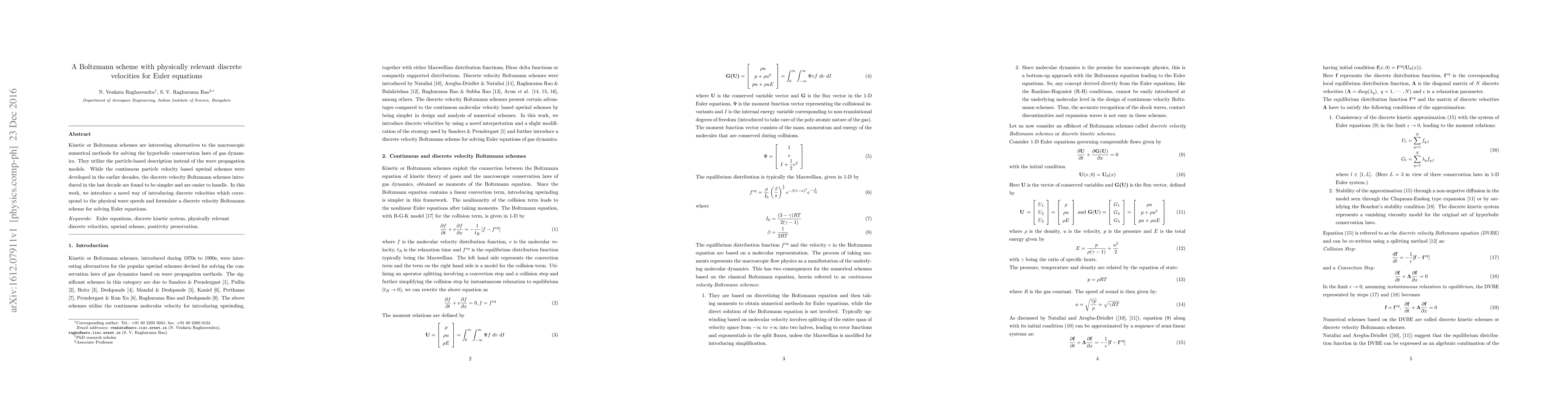Kinetic or Boltzmann schemes are interesting alternatives to the macroscopic numerical methods for solving the hyperbolic conservation laws of gas dynamics. They utilize the particle-based description instead of the wave propagation models. While the continuous particle velocity based upwind schemes were developed in the earlier decades, the discrete velocity Boltzmann schemes introduced in the last decade are found to be simpler and are easier to handle. In this work, we introduce a novel way of introducing discrete velocities which correspond to the physical wave speeds and formulate a discrete velocity Boltzmann scheme for solving Euler equations.