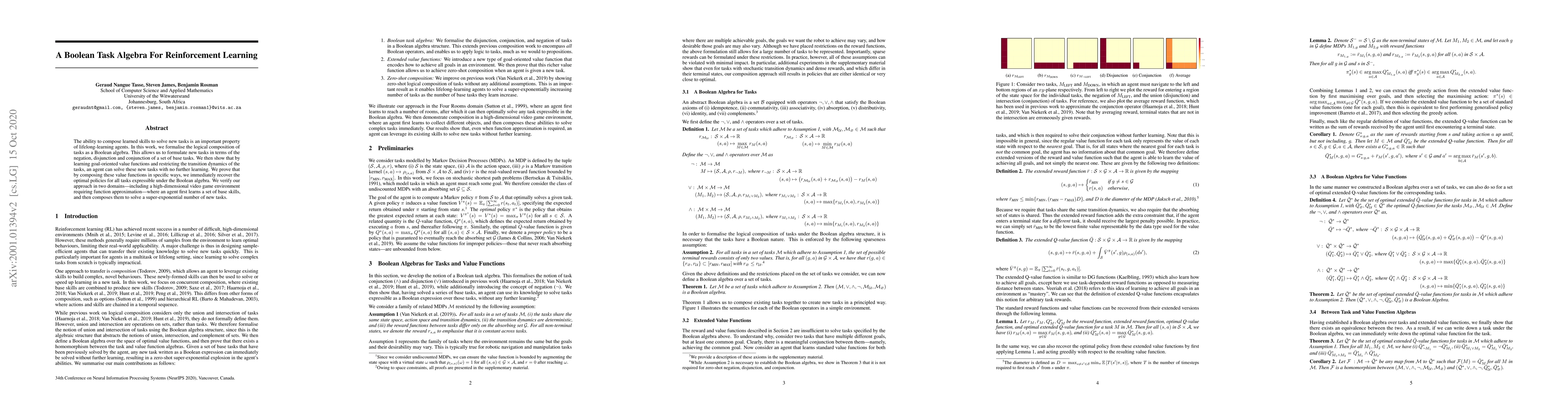 This research introduces a Boolean algebra to logically combine learned tasks, enabling an agent to solve new tasks without additional learning, by composing goal-oriented value functions. Verified in high-dimensional environments, the method allows agents to tackle a super-exponential number of new tasks post-learning a set of base skills.