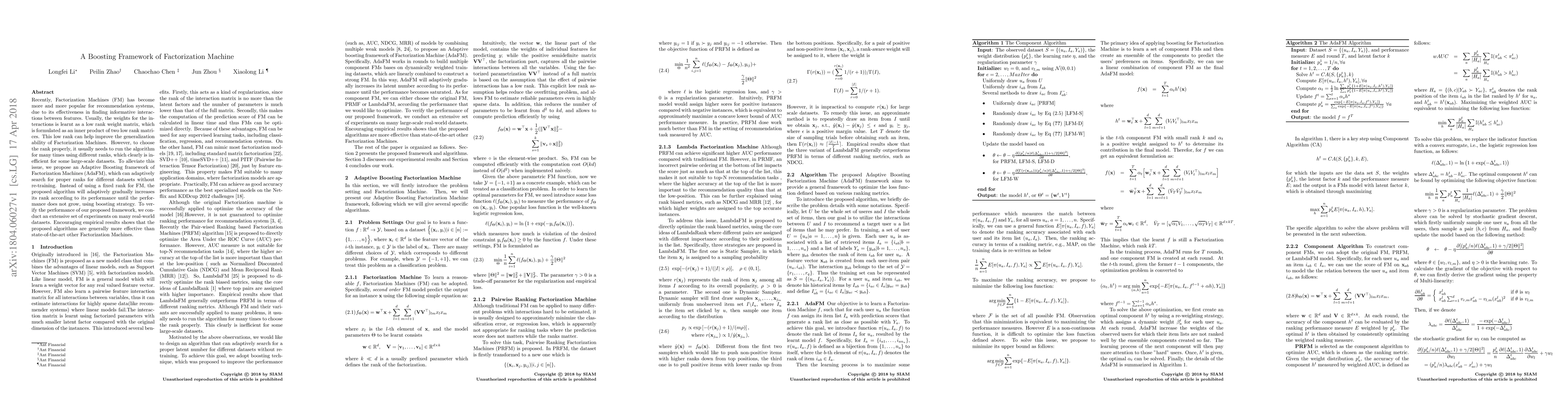 A new framework called Adaptive Boosting of Factorization Machines (AdaFM) improves upon traditional Factorization Machines by adaptively searching for the optimal rank to enhance performance on large-scale datasets without re-training.