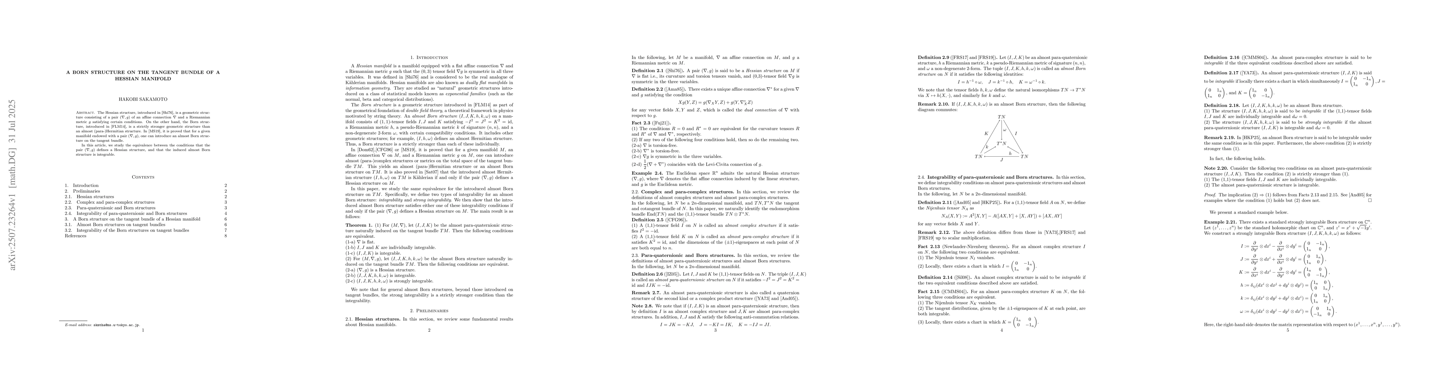 The paper proves the equivalence between the conditions defining a Hessian structure and the integrability of the induced almost Born structure on the tangent bundle, introducing a new perspective on geometric structures.