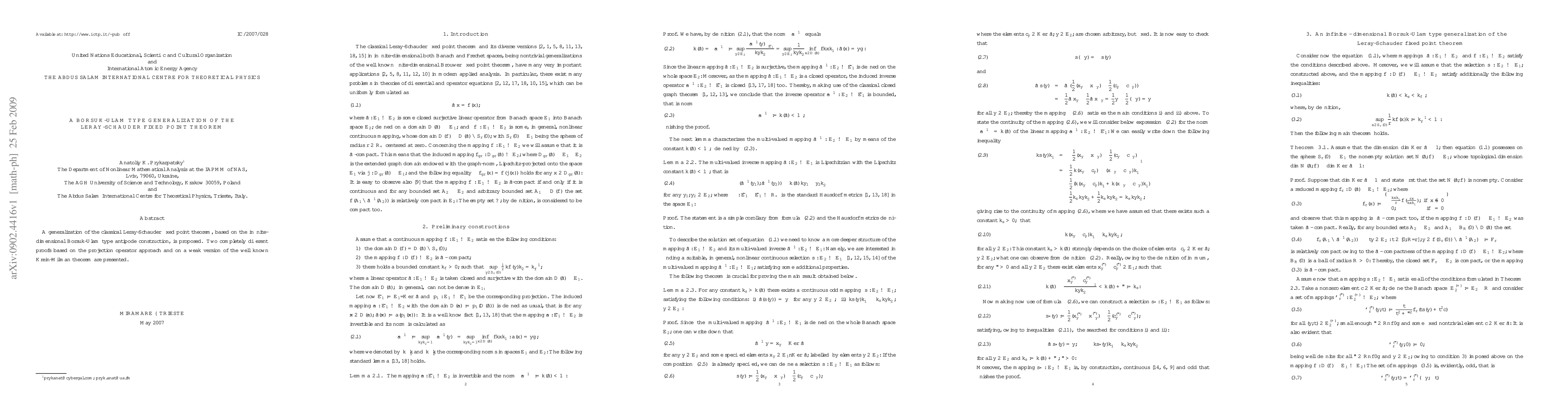 This paper proposes a generalization of the Leray-Schauder fixed point theorem using an infinite-dimensional Borsuk-Ulam type antipode construction, with proofs provided via the projection operator approach and a weak Krein-Milman theorem.