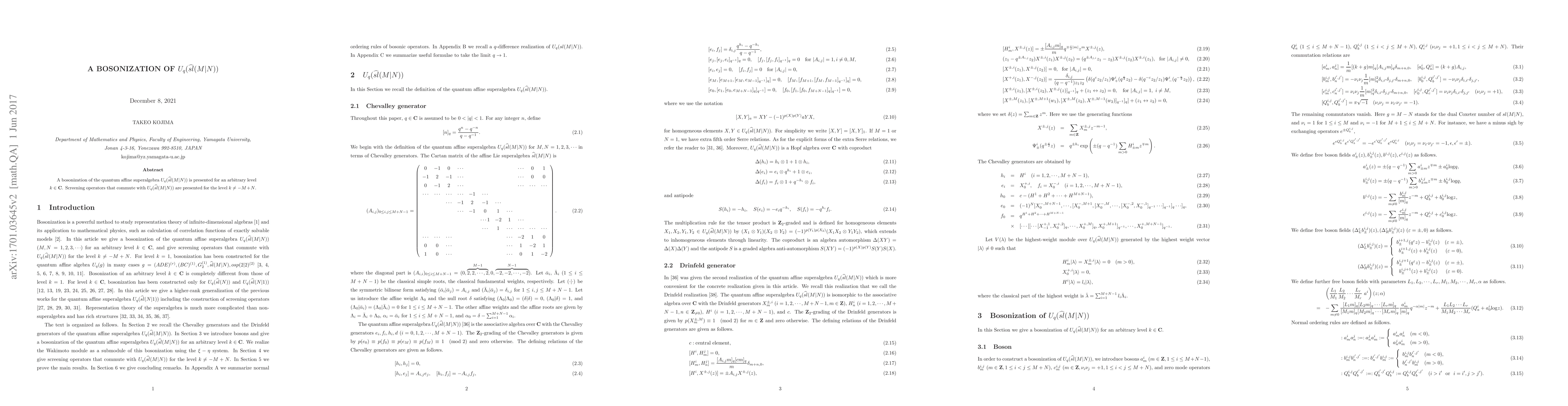 A bosonization of the quantum affine superalgebra $U_q(\widehat{sl}(M|N))$ is presented for an arbitrary level $k \in {\bf C}$. Screening operators that commute with $U_q(\widehat{sl}(M|N))$ are presented for the level $k \neq -M+N$.